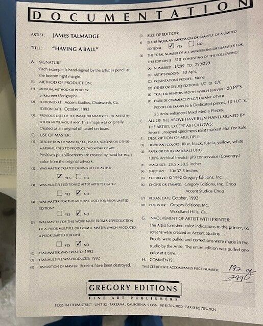 One of Talmadge's most popular images, "Having a Ball" is a serigraph on paper, image size 23.5x30.5".