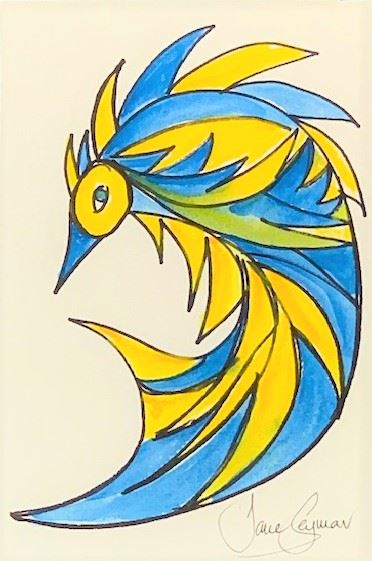 Jane SEYMOUR: Abstract Fantasy XXV. (Teal and Yellow Bird). Mixed-media on paper, signed lower right, 9 x 6" A newly-developed fresh, colorful and playful style during the time of Covid-19.