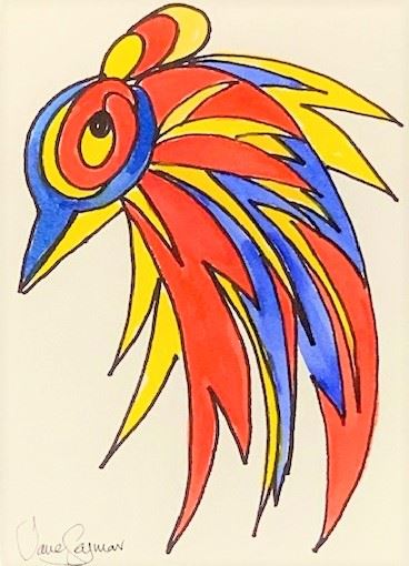 Jane SEYMOUR ORIGINAL: Abstract Fantasy XXIV. (Red, Blue and Yellow Bird). Mixed-media on paper, signed lower left, 8 1/4 x 6" A newly-developed fresh, colorful and playful style during the time of Covid-19.