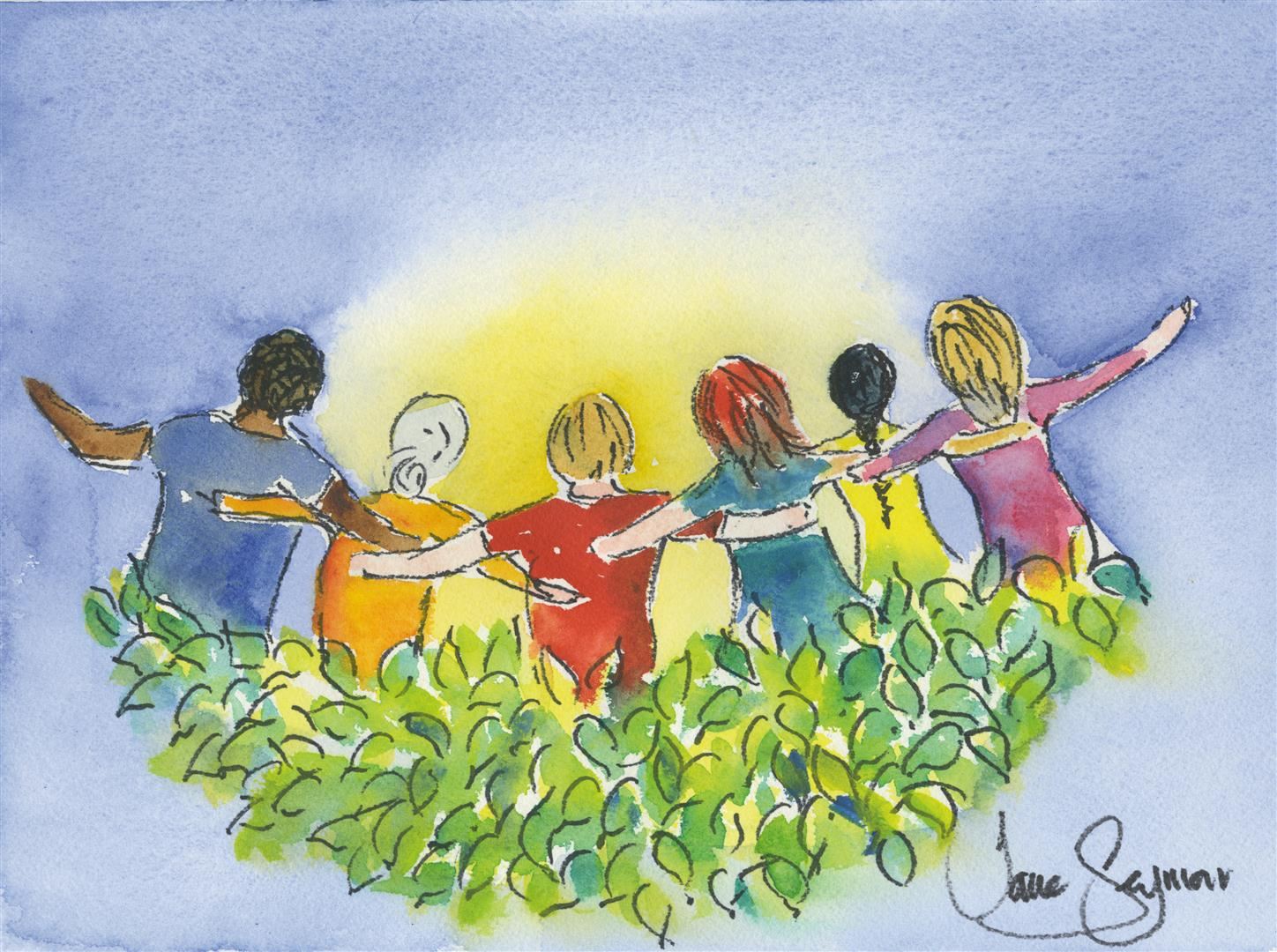 Jane SEYMOUR ORIGINAL: Open Heart Family Growing Together II.. Watercolor with pen and ink on paper, signed lower right, 9 x 12" Through the years the Open Heart Family has grown internationally, and this watercolor is from Jane SEYMOUR ORIGINAL's series of images illustrating the community growing together.