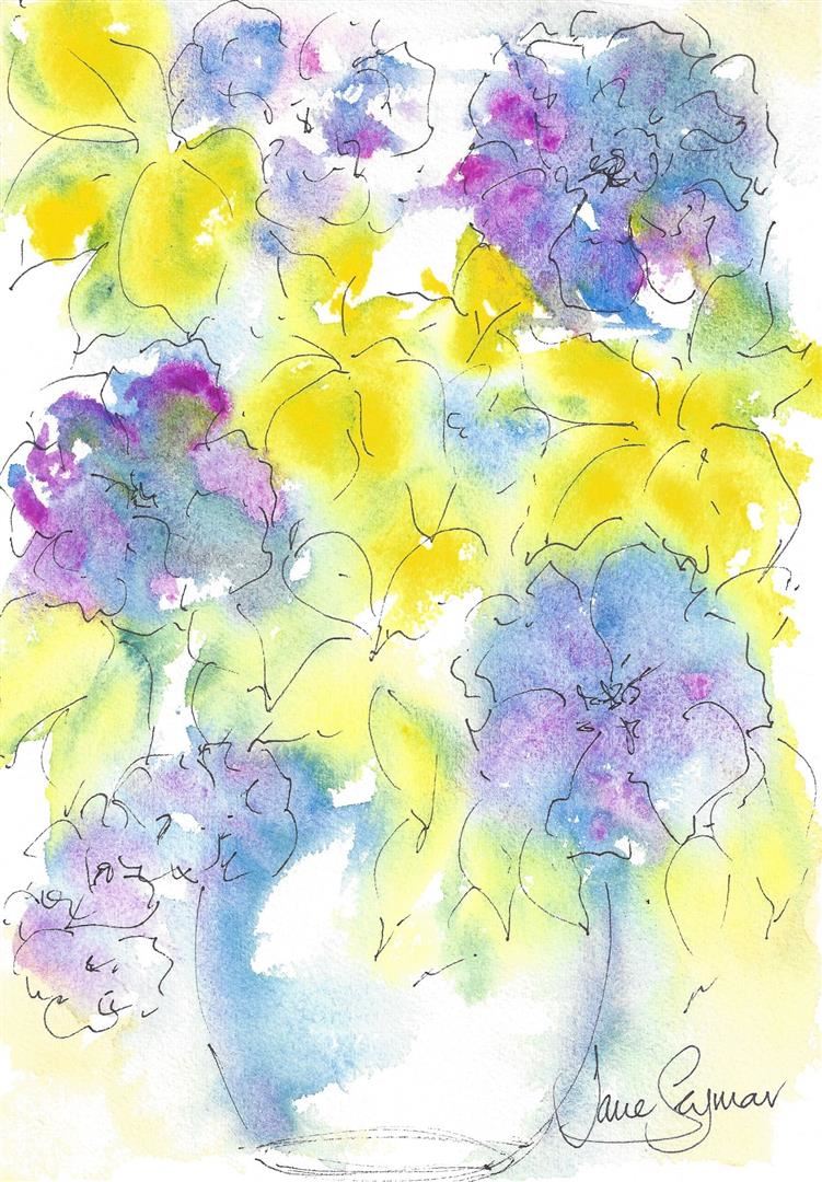 Jane SEYMOUR ORIGINAL: Serenity Bouquet in Vase . Watercolor with pen and ink on paper, signed lower right, 10 1/4 x 7" Jane SEYMOUR ORIGINAL's signature style of watercolor with pen and ink, of one of her favorite floral themes, colorful bouquets in vases.