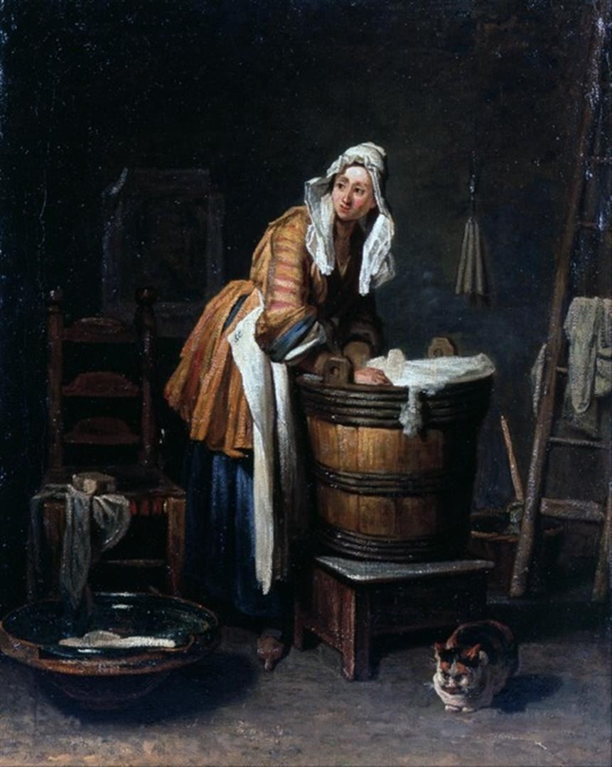 Artist: Jean Baptiste Chardin - Title: Washerwoman - Medium: Fine Art Reproduction Giclee on Canvas - Image Size: Approximately 20 inches x 15.5 inches - Unframed on Unstretched Canvas - Biography: Jean-Baptiste-Simeon Chardin (November 2, 1699 - December 6, 1779) was an 18th-century French painter. He is considered a master of still life, and is also noted for his genre paintings which depict kitchen maids, children, and domestic activities. Carefully balanced composition, soft diffusion of light, and granular impasto characterize his work.