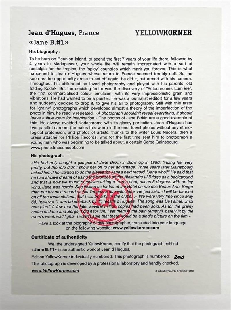 Jean D Hugues Jane Birkin #1 French Singer Actress YellowKorner Certified Photograph. Certificate of Authenticity from YellowKorner affixed to the back. Matted Dimensions 16"x20". Protected with Clear Mylar Sleeve.