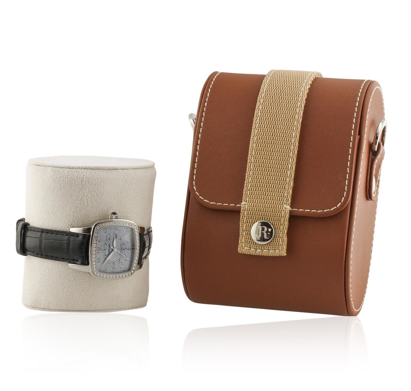One ladies Jean Richard Wristwatch featuring: Automatic Movement, Diamond Bezel, Stainless Steel Lugs, Case, Crown, Bezel, Black Leather Bracelet with Black Stitching, Gray Mother of Pearl Dial with Analog Display, Green Arabic Numerals, Date at 3 o'clock position. Watch weighs a total of 53.2 grams.