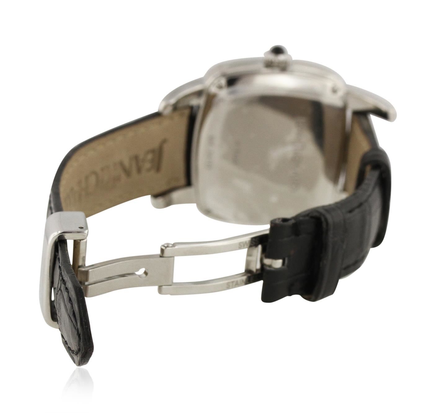 One ladies Jean Richard Wristwatch featuring: Automatic Movement, Diamond Bezel, Stainless Steel Lugs, Case, Crown, Bezel, Black Leather Bracelet with Black Stitching, Gray Mother of Pearl Dial with Analog Display, Green Arabic Numerals, Date at 3 o'clock position. Watch weighs a total of 53.2 grams.