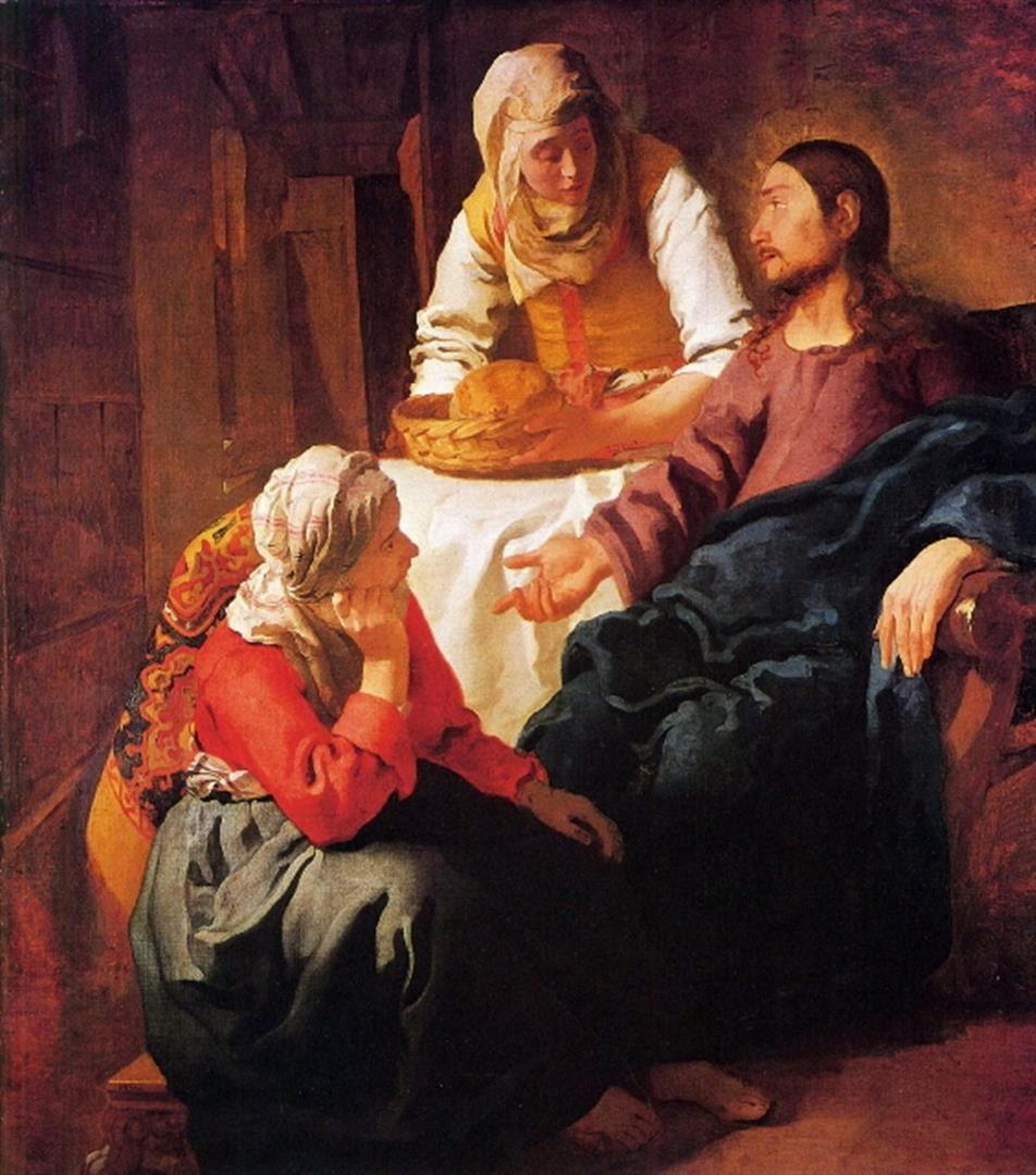Artist: Johannes Vermeer - Title: Christ in the House of Mary and Martha - Medium: Fine Art Giclee on Canvas - Image Size: Approximately 32 inches x 28.25 inches - Unframed on Unstretched Canvas - Biography: Johannes Vermeer (October 1632 - December 1675) was a Dutch Baroque Period painter who specialized in domestic interior scenes of middle class life. During his lifetime, he was a moderately successful provincial genre painter, recognized in Delft and The Hague. Nonetheless, he produced relatively few paintings and evidently was not wealthy, leaving his wife and children in debt at his death.Vermeer worked slowly and with great care, and frequently used very expensive pigments. He is particularly renowned for his masterly treatment and use of light in his work.