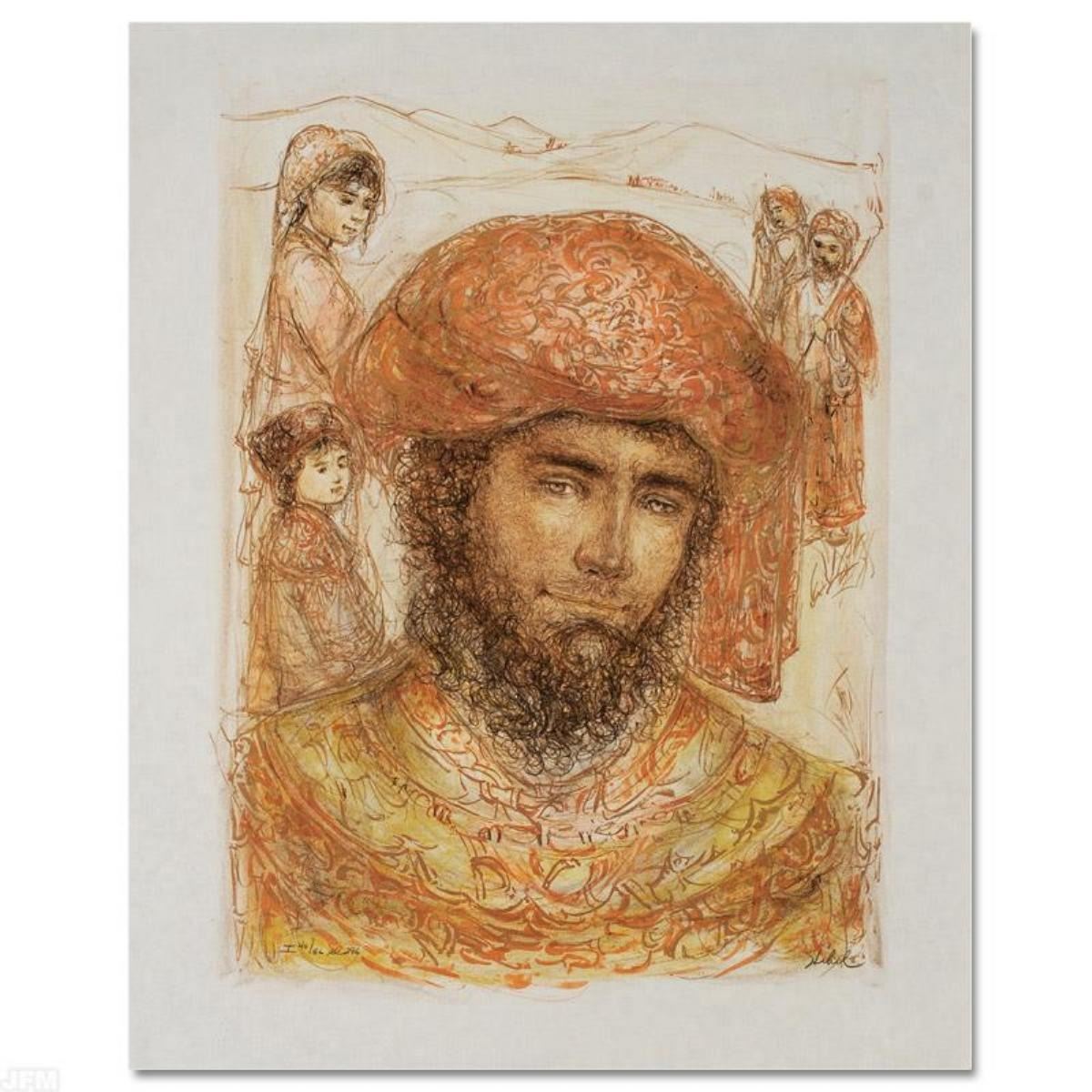 "Joshua at the Jordan" is a limited edition lithograph on paper, numbered and hand signed by Edna Hibel (1917-2014). Includes Certificate of Authenticity! Measures approx. 22" x 30" (with border), 17" x 23" (image).