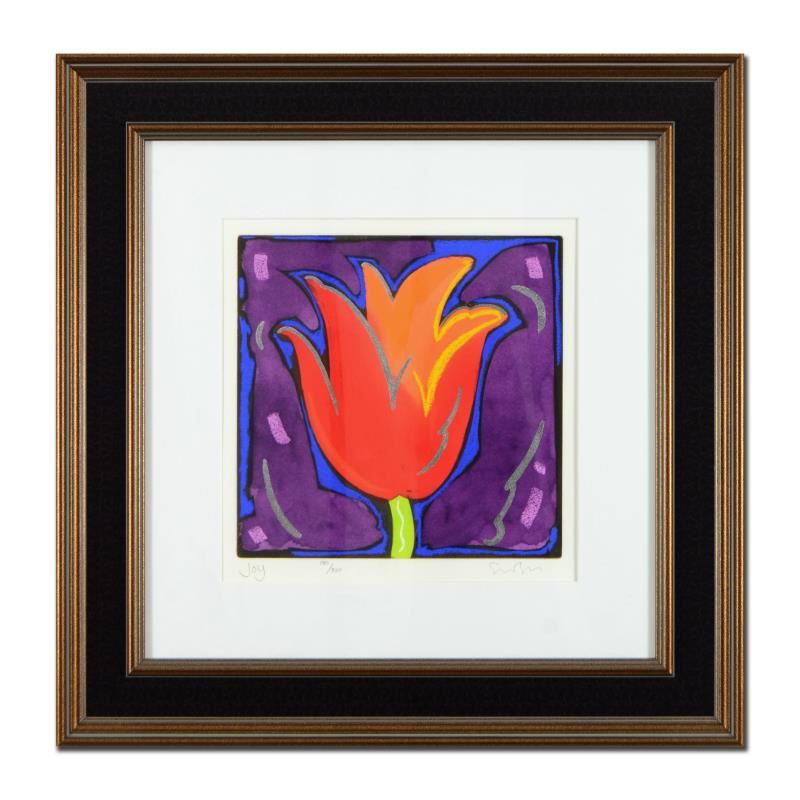 "Joy" is a hand colored limited edition etching on rag paper by Simon Bull, numbered and hand signed by the artist. Includes Letter of Authenticity. Measures approx. 24.5" x 24.5" (framed), 12" x 12" (image). There is minor wear on the corners and edges of the frame.