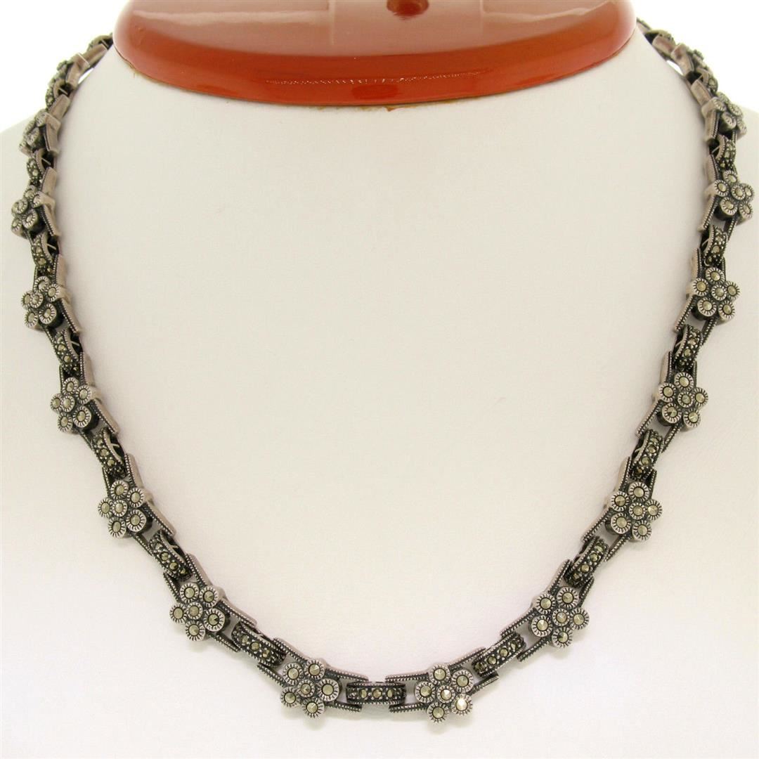 One Judith Jack Sterling Silver Marcasite Cluster Flower 16" Chain Necklace w/ Box. Item Details: Material: Solid .925 Sterling Silver, Weight: 45.43 Grams, Chain Type: Cluster Flower and Bar Link Chain, Chain Length: 16 Inches, Chain Width: 7.87mm, Chain Thickness: 4.54mm, Clasp: Box Clasp w/ Safety Latch, Signature(s): STERLING Condition: Like New w/ Original Pouch and Box!