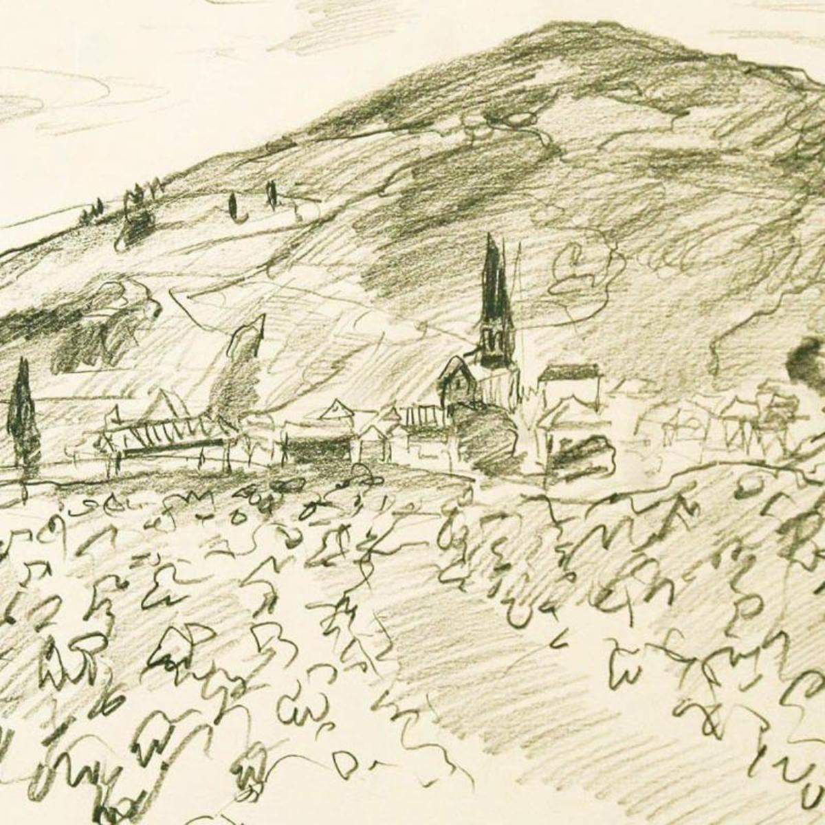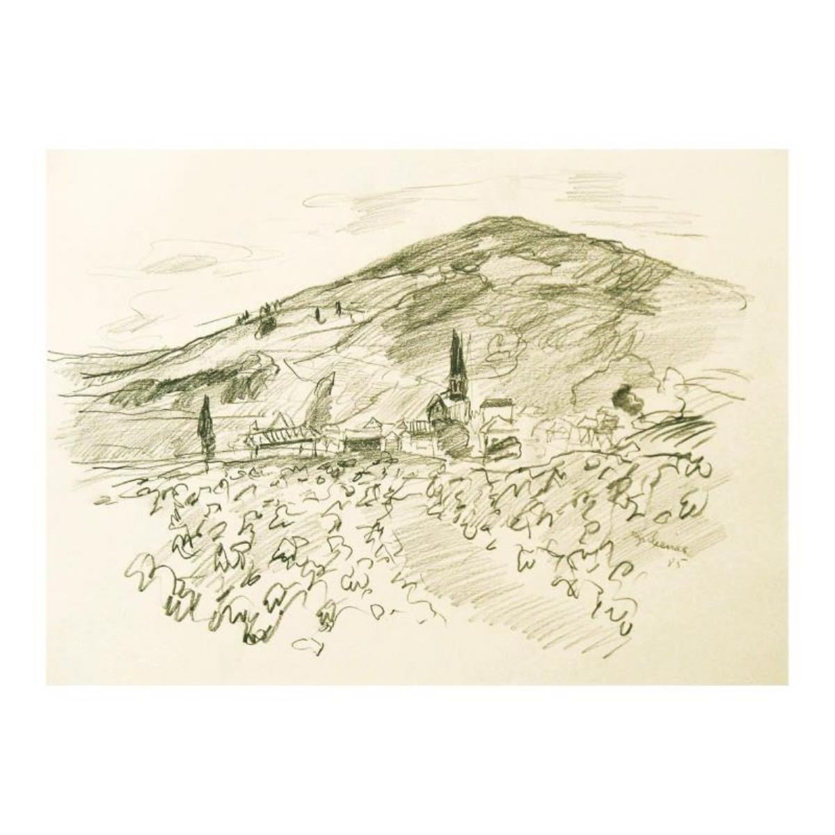 Julienas in Beaujolais, France by Ensrud Original. "Julienas in Beaujolais, France" is an original Pencil on Paper by Wayne Ensrud. The piece is hand signed by the artist and comes with a Certificate of Authenticity. Measures approximately 15" x 18".