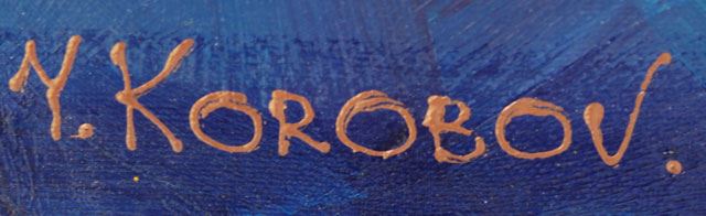 KOROBOV FLOWERS IN BLUE VASE ACRYLIC. Artist: Yana Korobov (b. 1972) - Title: FLOWERS IN BLUE VASE - Medium: Original Acrylic on Canvas - Signature: This one-of-a-kind work is hand-signed by the artist at the bottom of the image - Image Size: Approximately 16 inches x 16 inches - Framed: Unframed on Unstretched Canvas - Biography: Yana Korobov was born in the Ukraine in 1972. She studied at her local High School of the Arts in Kharkiv. She then went on to study at the Art & Industry College and the Sloboda State University in Kharkiv. - She graduated as an art teacher from the State Art College in Kharkiv. In 2003 she immigrated to Israel. She is a young and upcoming artist whose work has been admired worldwide. Her artwork has recently been exhibited in Israel, the United Stated and Europe. - Warranty: Item GUARANTEED to be as described
