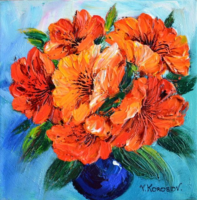 KOROBOV SORBET BOUQUET SIGNED ORIGINAL ACRYLIC. Artist: Yana Korobov (b. 1972) - Title: Sorbet Bouquet - Medium: Original Acrylic on Canvas - Signature: This one-of-a-kind work is hand-signed by the artist at the bottom of the image - Image Size: Approximately 16 inches x 16 inches - Framed: Stretched Canvas ready to be framed - Details: This work comes with a Certificate of Authenticity - Biography: Yana Korobov was born in the Ukraine in 1972. She studied at her local High School of the Arts in Kharkiv. She then went on to study at the Art & Industry College and the Sloboda State University in Kharkiv. She graduated as an art teacher from the State Art College in Kharkiv. In 2003 she immigrated to Israel. She is a young and upcoming artist whose work has been admired worldwide. Her artwork has recently been exhibited in Israel, the United Stated and Europe. - Warranty: Item GUARANTEED to be as described