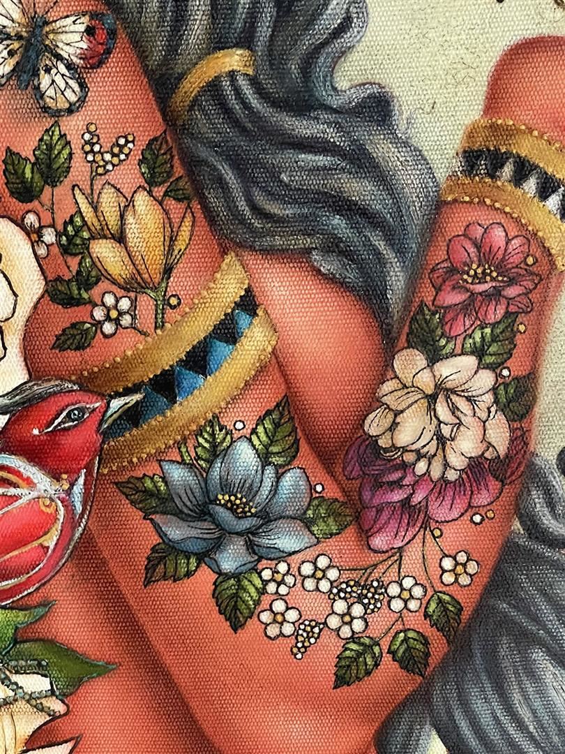 Dazzling original oil on canvas. Hand signed by artists. Artwork comes with a certificate of authenticity. This artwork comes framed ready to hand. Size 21x34"