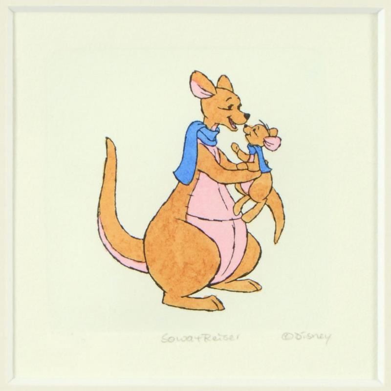 "Kanga" is a limited edition etching on paper with hand-tinted coloring from Disney, numbered out of 500. This piece comes framed. Measures approx. 9" x 9" (with frame), 2" x 2" (image).