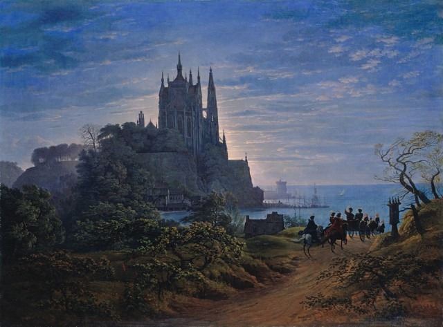 Artist: Karl Friedrich Schinkel - Title: Gothic Church on a Rock by the Sea - Medium: Fine Art Reproduction Giclee on Canvas - Image Size: Approximately 23.5 inches x 32 inches - Unframed on Unstretched Canvas - Biography: Karl Friedrich Schinkel (13 March 1781 - 9 October 1841) was a Prussian architect, city planner, and painter who also designed furniture and stage sets. Schinkel was one of the most prominent architects of Germany and designed both neoclassical and neogothic buildings. His most famous buildings are found in and around Berlin.