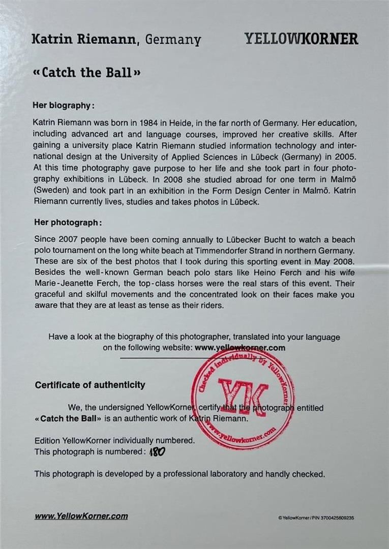 Katrin Riemann Germany Catch The Ball YellowKorner Certified Photograph. Certificate of Authenticity from YellowKorner affixed to the back. Matted Dimensions 16"x20". Protected with Clear Mylar Sleeve.