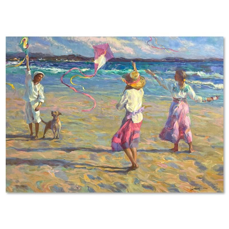 "Kite Festival" is a limited edition publisher's proof on stretched canvas by Don Hatfield, numbered 11/11 and hand signed by the artist. Includes Letter of Authenticity. Measures approx. 26" x 35" (image). There is very faint crease around the perimeter