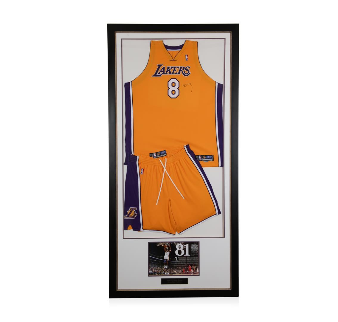 This collage features an original game used uniform of Los Angeles Lakers legend Kobe Bryant who started of his career with the Lakers as #8. All proper game used tags are attached . Framed 40" x 80" framed.