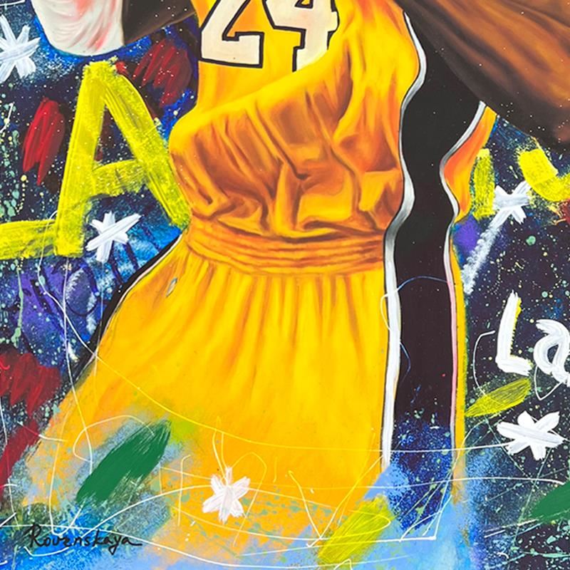 "Kobe Bryant" is a one-of-a-kind mixed media on deckle edge paper by Nastya Rovenskaya; hand signed by the artist. This piece comes custom framed and includes letter of authenticity. Measures approximately 46" x 32.5" (framed), 40" x 26.5" (image).