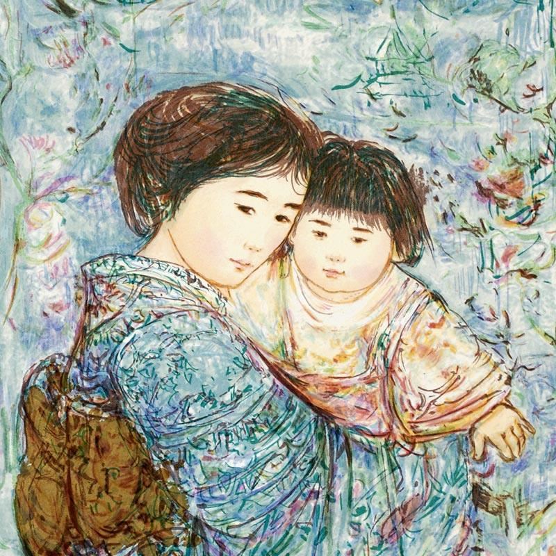 "Kyoko and Sanayuki" is a limited edition serigraph on paper, numbered and hand signed by Edna Hibel (1917-2014). Includes Certificate of Authenticity! Measures approx. 15" x 20.5" (with border), 12" x 15" (image).