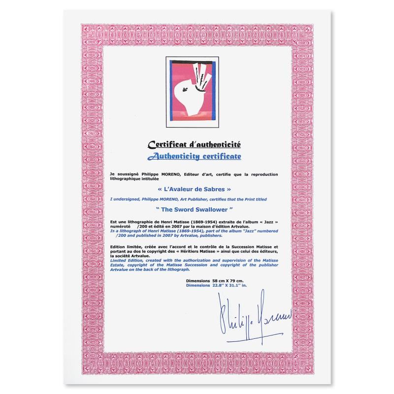 "L'Avaleur de Sabres (The Sword Swallower)" is a limited edition lithograph by Henri Matisse (1869-1954). This piece comes from an edition of 200 authorized by the Matisse Estate; the edition number is not on the piece itself but on the certificate. This piece comes custom framed. Includes Certificate of Authenticity. Measures approx. 29" x 37" (frame), 23" x 31" (image).