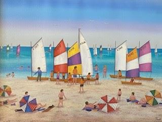 This 18x24" Fanch Ledan is an original acrylic on stretched canvas, a scene of a sailing school in southern France ; with artist's COA.