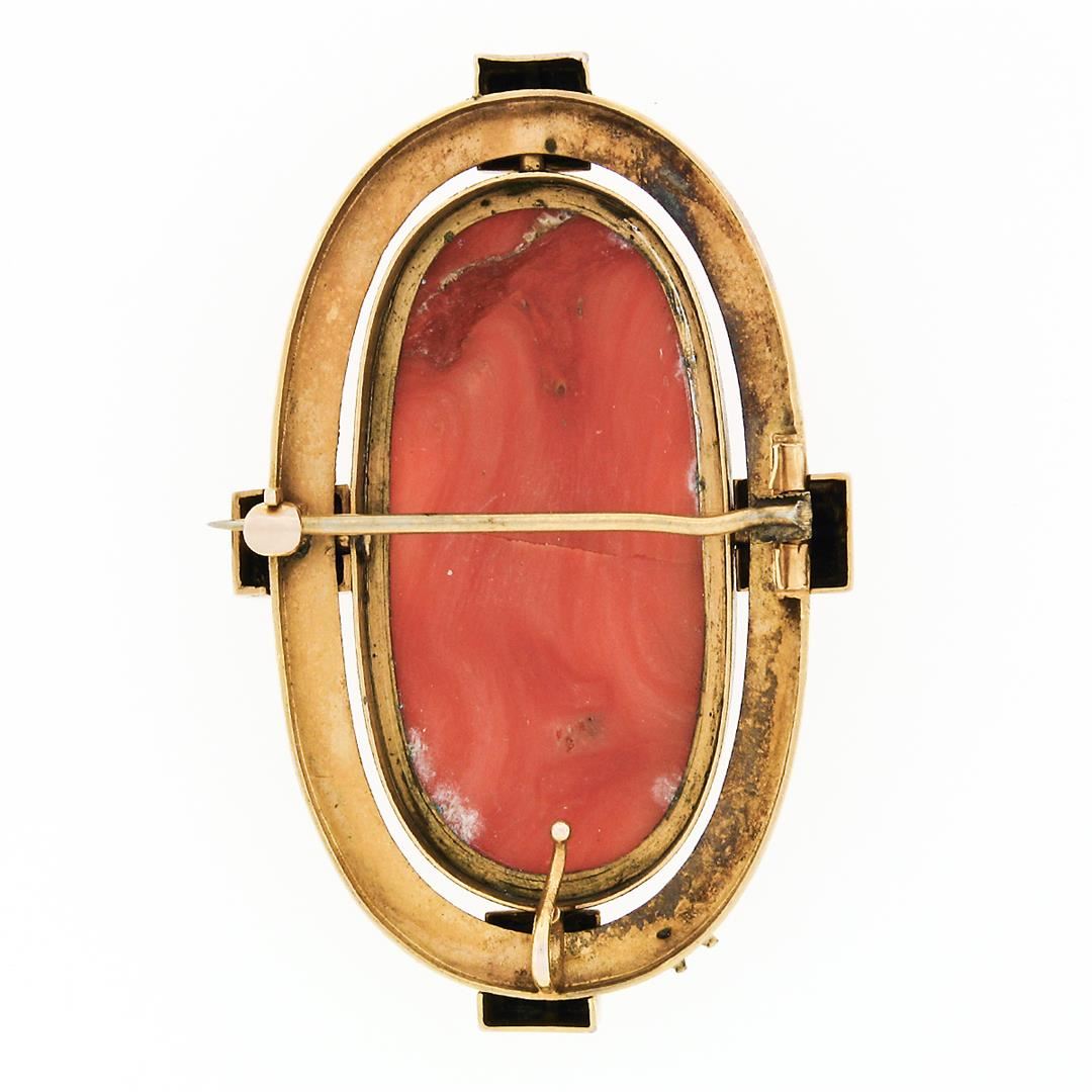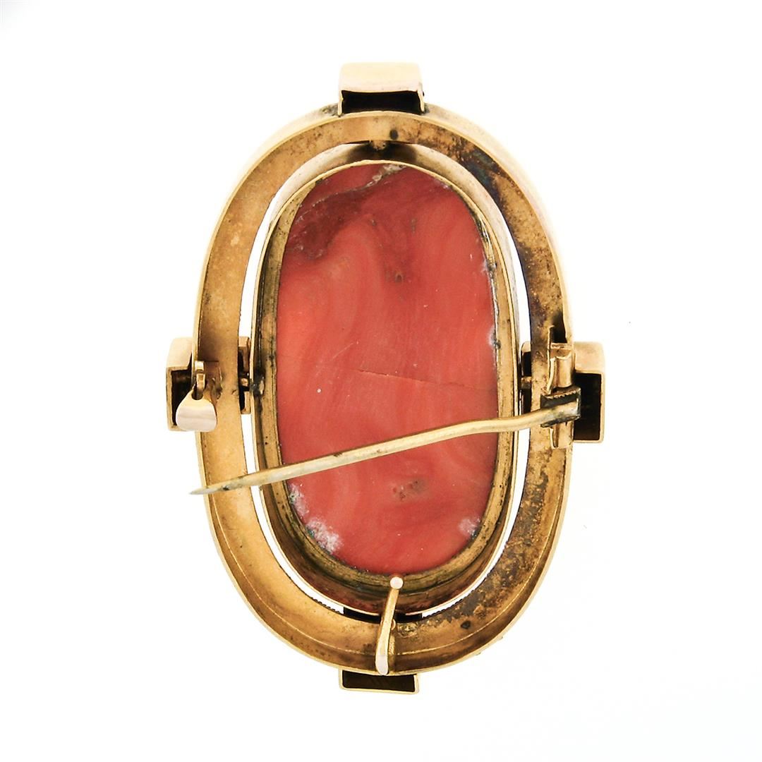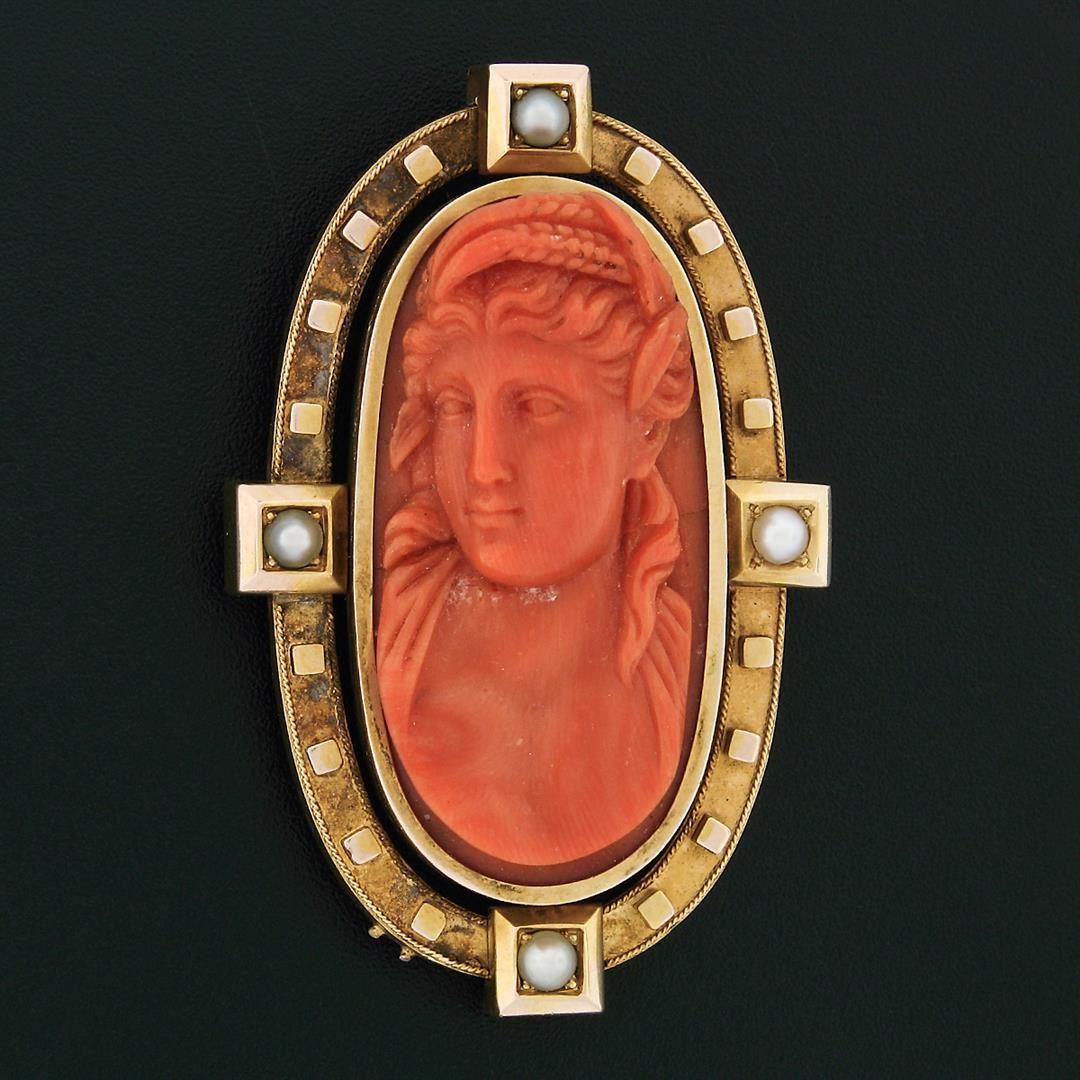 An antique large cameo pin brooch, with 1 Gia certified oval carved natural coral (36.88x17.94mm), and 4 natural seed pearls (3.15mm). Measures 53.44x33.85mm and weighs a total of 18.42 grams. Comes with all original relevant certifications.