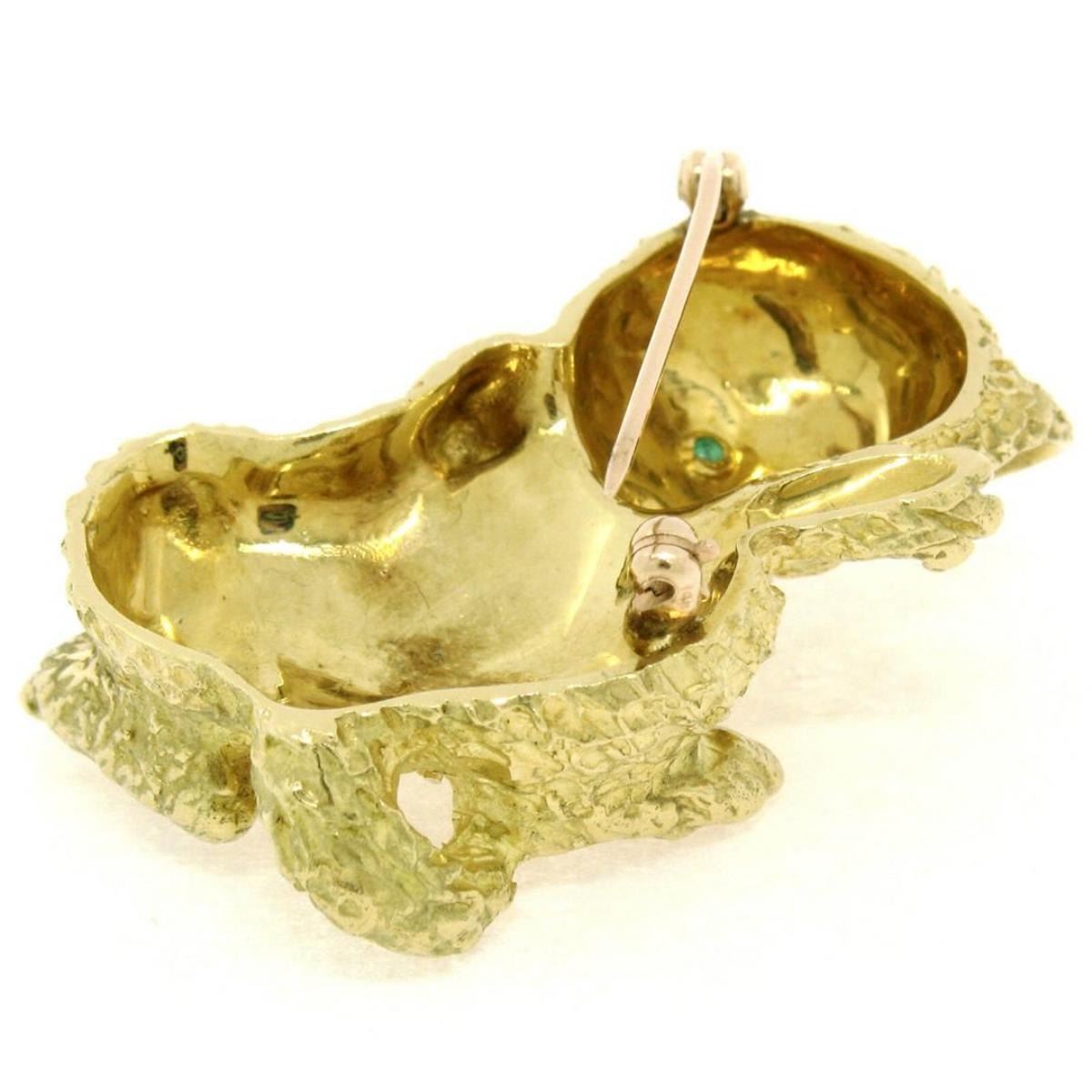 A large solid 18k yellow gold textured kitten brooch with 2 round cut natural emerald eyes (0.08ctw) and a genuine cultured pearl ball (5.5mm). Measures 35.7x23.0mm and weighs a total of 28.31 grams.