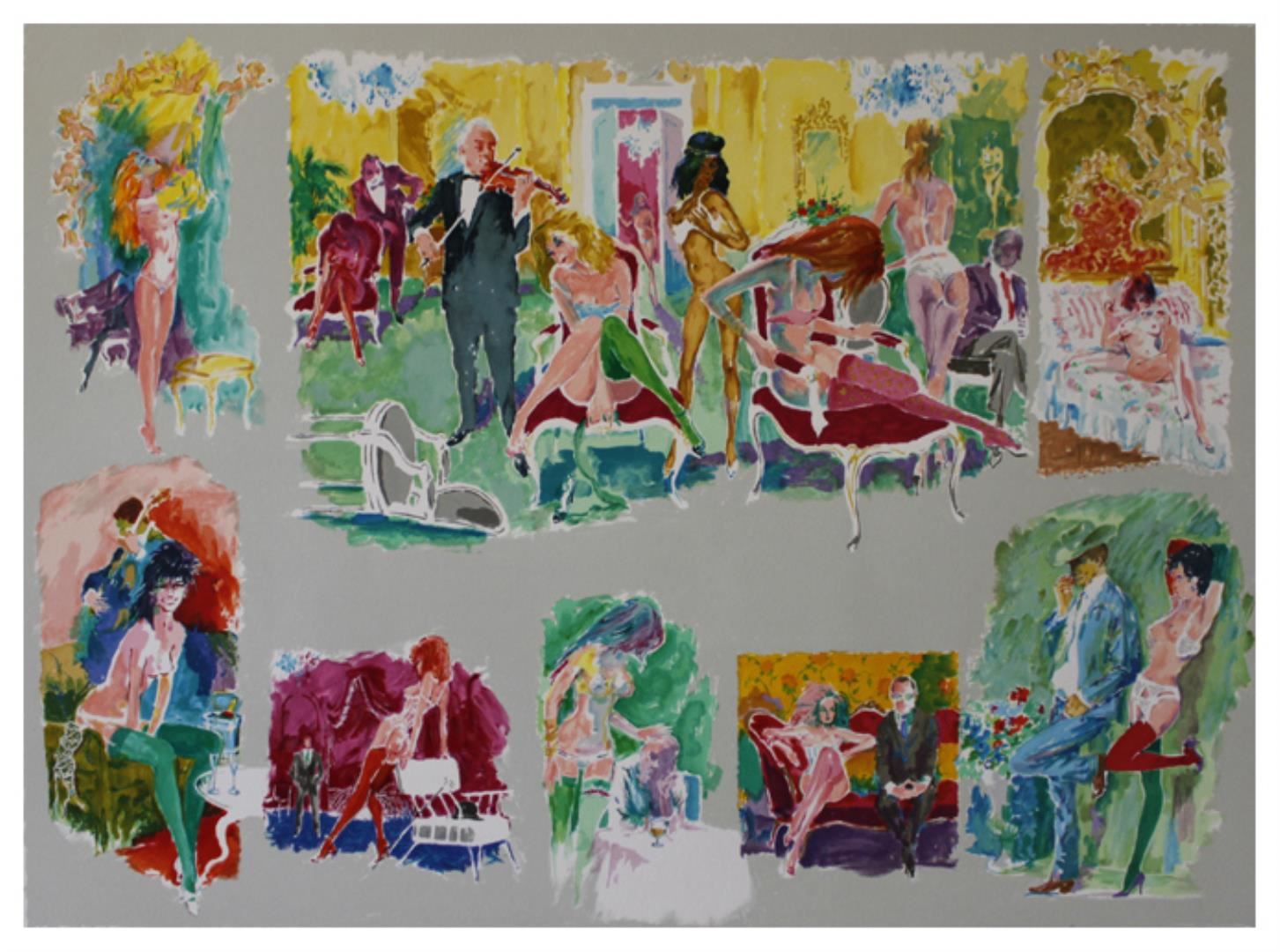 Artist: Leroy Neiman Title: Bordello Medium: Serigraph on Paper Signature: Hand-signed by the Artist Limited Edition: 270 Image Size: Approximately 34 inches x 43 inches Framed: Unframed Details: This work comes with a Certificate of Authenticity Biography: Leroy Neiman's style explodes with the dramatic intensity of Abstract Expressionist brush strokes, strokes that pick out action that is strikingly accurate. This unique combination is so appealing that Neiman has brought art into the lives of more people than most post-war American artists put together.