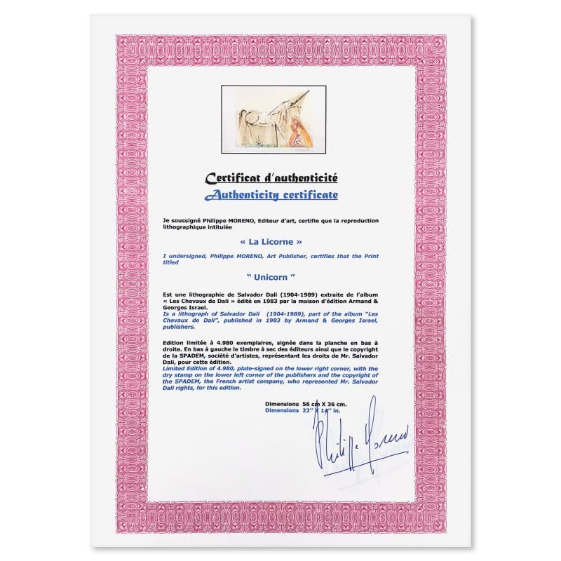 "La Licorne (Unicorn)" is a limited edition lithograph by Salvador Dali (1904-1989), bearing the plate signature of the artist. This piece was published by Armand & Georges Israel in 1983 during Dali's lifetime and under his supervision. This piece was printed on Velin D'arches paper in Paris. This work is referenced in The Official Catalog of the Graphic Works of Salvador Dali (Albert Fields). This piece comes custom framed. Includes Certificate of Authenticity. Measures approx. 28" x 20" (frame), 22" x 14" (image). This item requires special handling and may have a longer than usual turnaround.