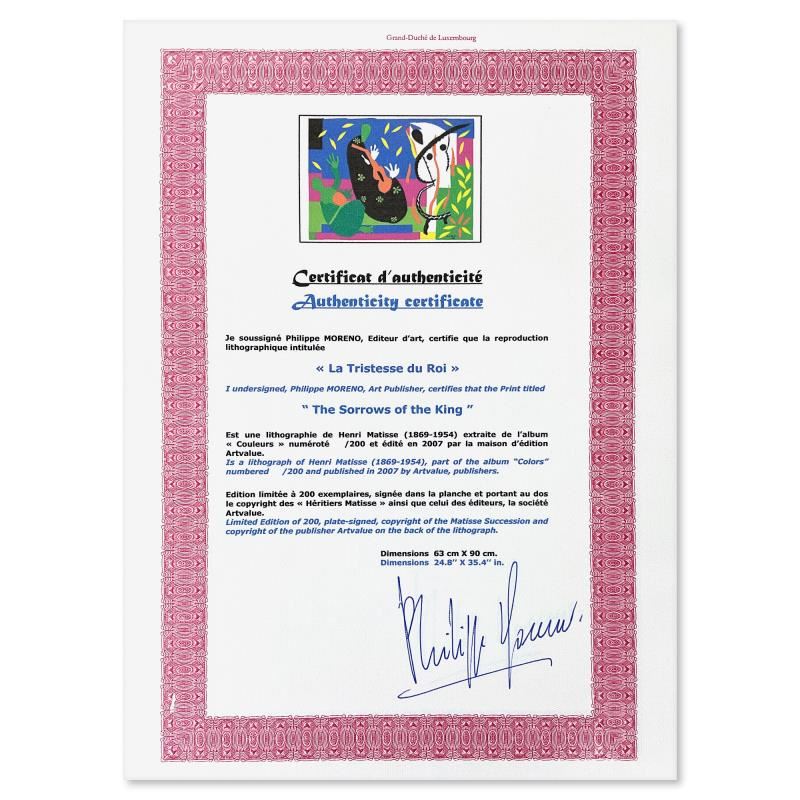 "La Tristesse du roi" is a limited edition lithograph by Henri Matisse (1869-1954), bearing the plate signature of the artist. This piece comes from an edition of 200 authorized by the Matisse Estate; the edition number is not on the piece itself but on the certificate. This piece comes custom framed. Includes Certificate of Authenticity. Measures approx. 41.5" x 31" (frame), 35.5" x 25" (image). This item requires special handling and may have a longer than usual turnaround.