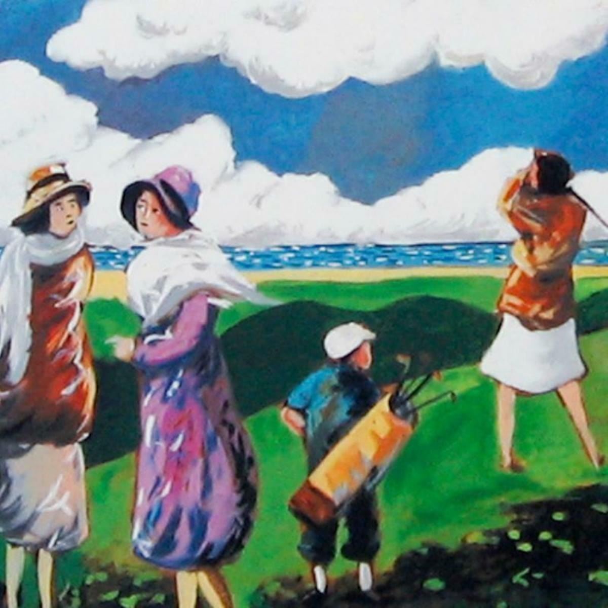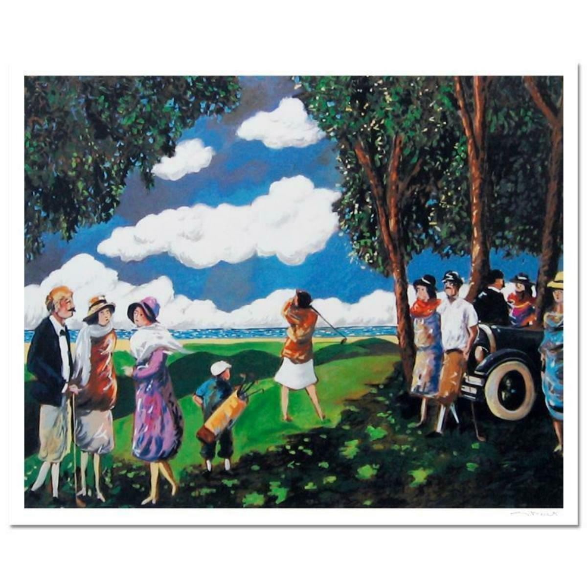 "Ladies At Tee" is a limited edition serigraph on paper by Guy Buffet. It is numbered, hand-signed by the artist, and comes with a Certificate of Authenticity. Measures approx. 35" x 28" (image).