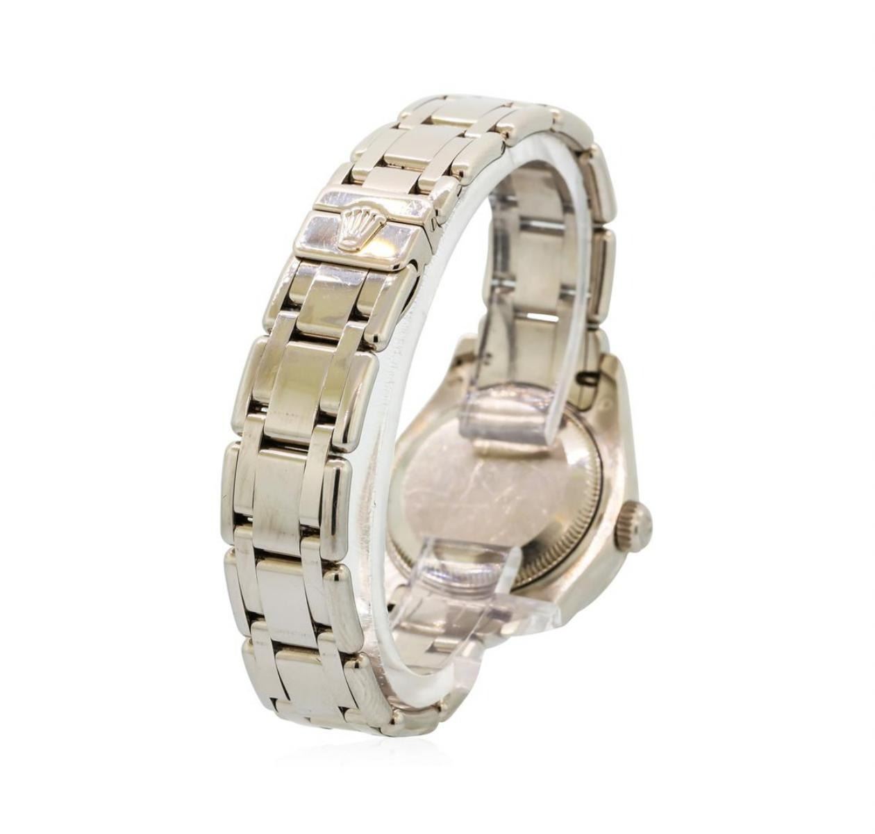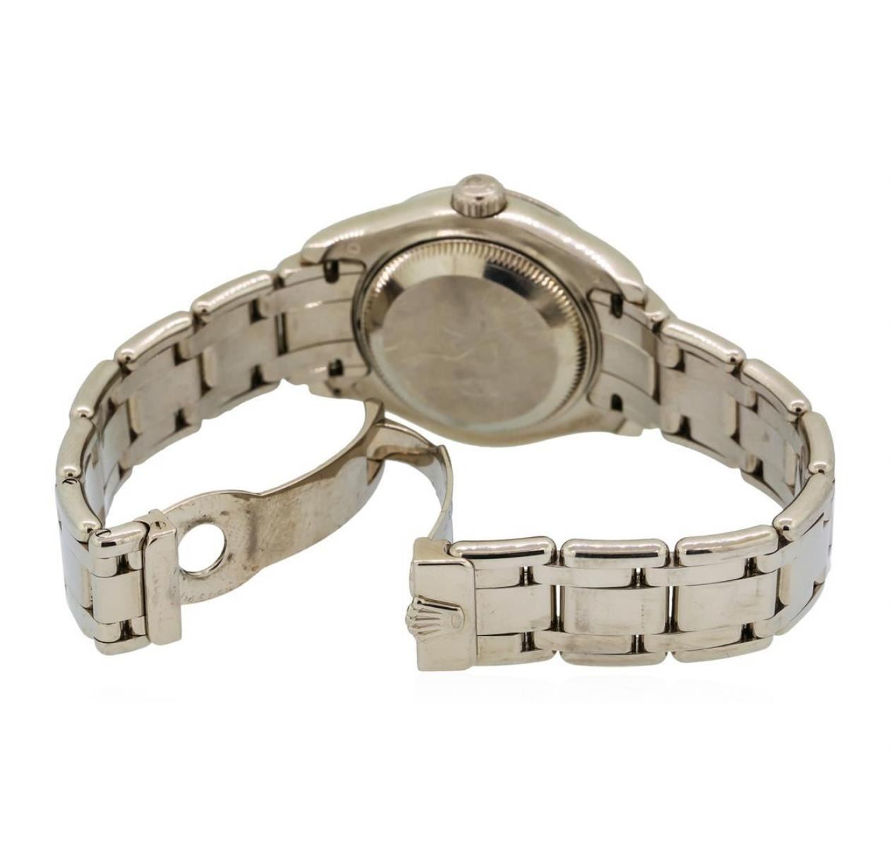One ladies, hand crafted & machine milled Rolex Masterpiece DateJust, model wristwatch electronically tested 18KT White gold, Swiss & Rolex Hallmarked Case: 29mm oyster. Rolex Signature Crown: with high relief logo, Bezel: diamond set, Rolex Hallmarked Crystal: synthetic sapphire cyclops lens. Circa 2007. Movement: superlative chronometer automatic. Rolex signed Dial: mother of pearl, with baton hands and raised diamond markers, Date Window: 3 o'clock position, quick set, Rolex Bracelet: 18KT White gold Pearlmaster links, Condition: G-6 Extra Fine. Bright polish finish. Six and three quarter inch length. Swiss Hallmarked Rolex concealed deployment clasp, with logo. Containing: Thirty Two round brilliant cut diamonds, estimated total weight equals 1.65ct. Set & graded in the bezel. Clarity VVS-2 to VS-1 Color E - G. Total Weight of Diamonds 1.65ct. Total Weight of Watch 109.56gm. AIG Appraised.