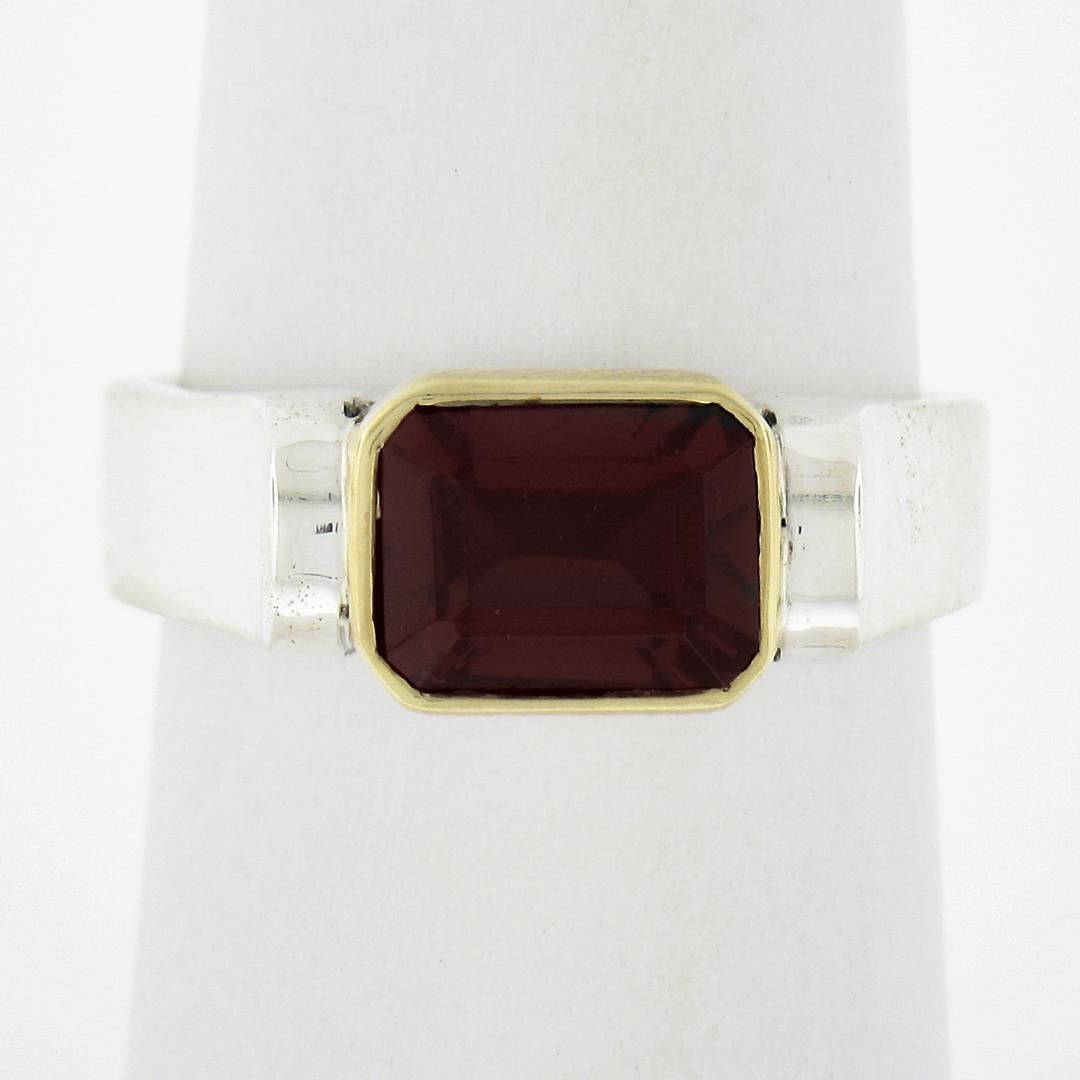 A solid 18k yellow gold & silver solitaire ring by Lagos Caviar, featuring 1 emerald cut natural rhodolite garnet (7.6x5.5mm). The ring is size 6.5, weighs a total of 5.70 grams, and measures 7.2mm wide.