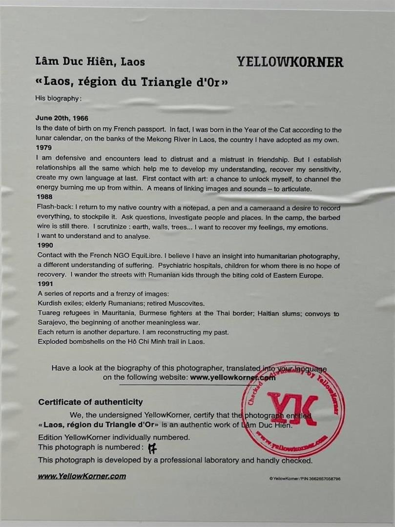 Lam Duc Hien Laos Laos Region Du Triangle D Or YellowKorner Certified Photograph. Certificate of Authenticity from YellowKorner affixed to the back. Matted Dimensions 16"x20". Protected with Clear Mylar Sleeve.