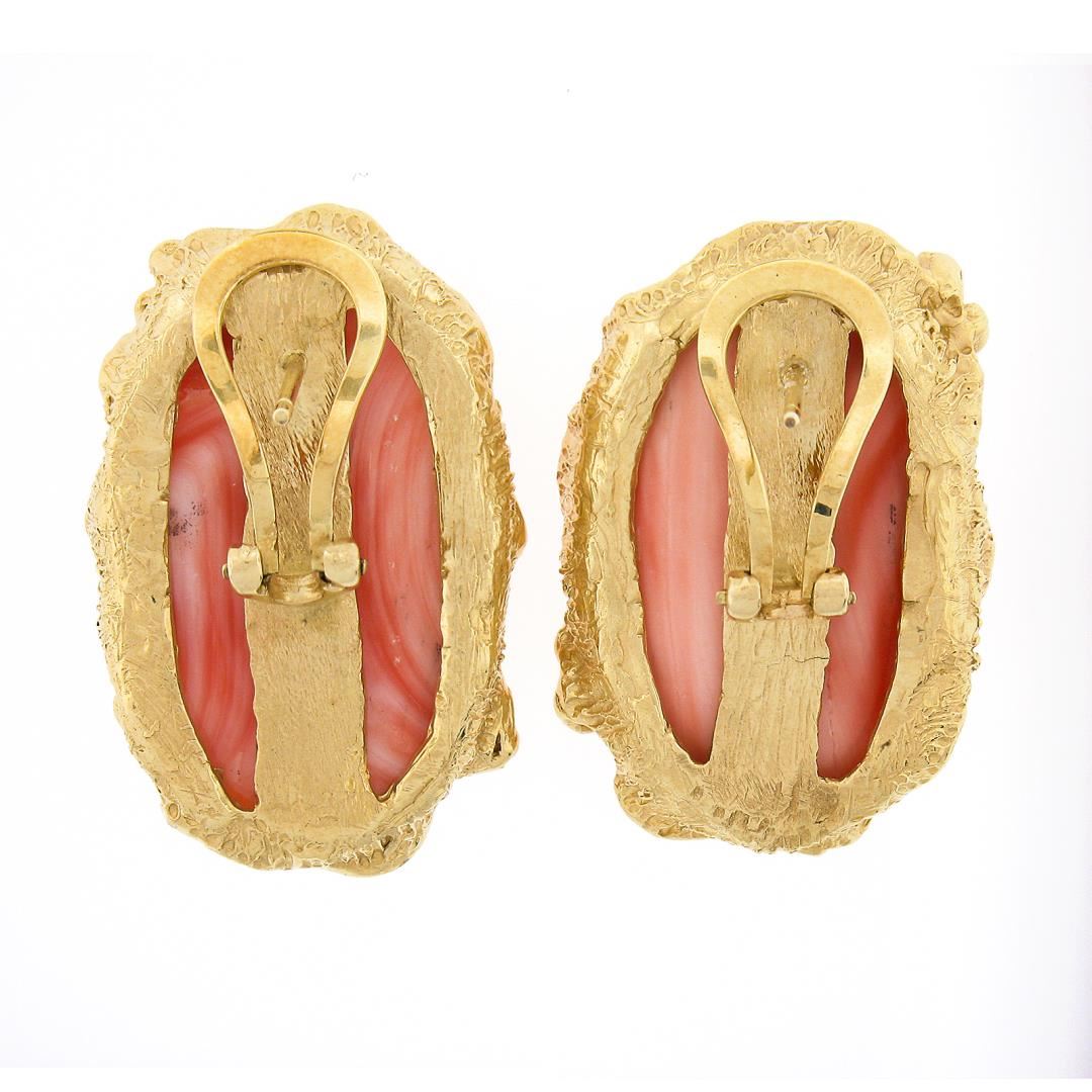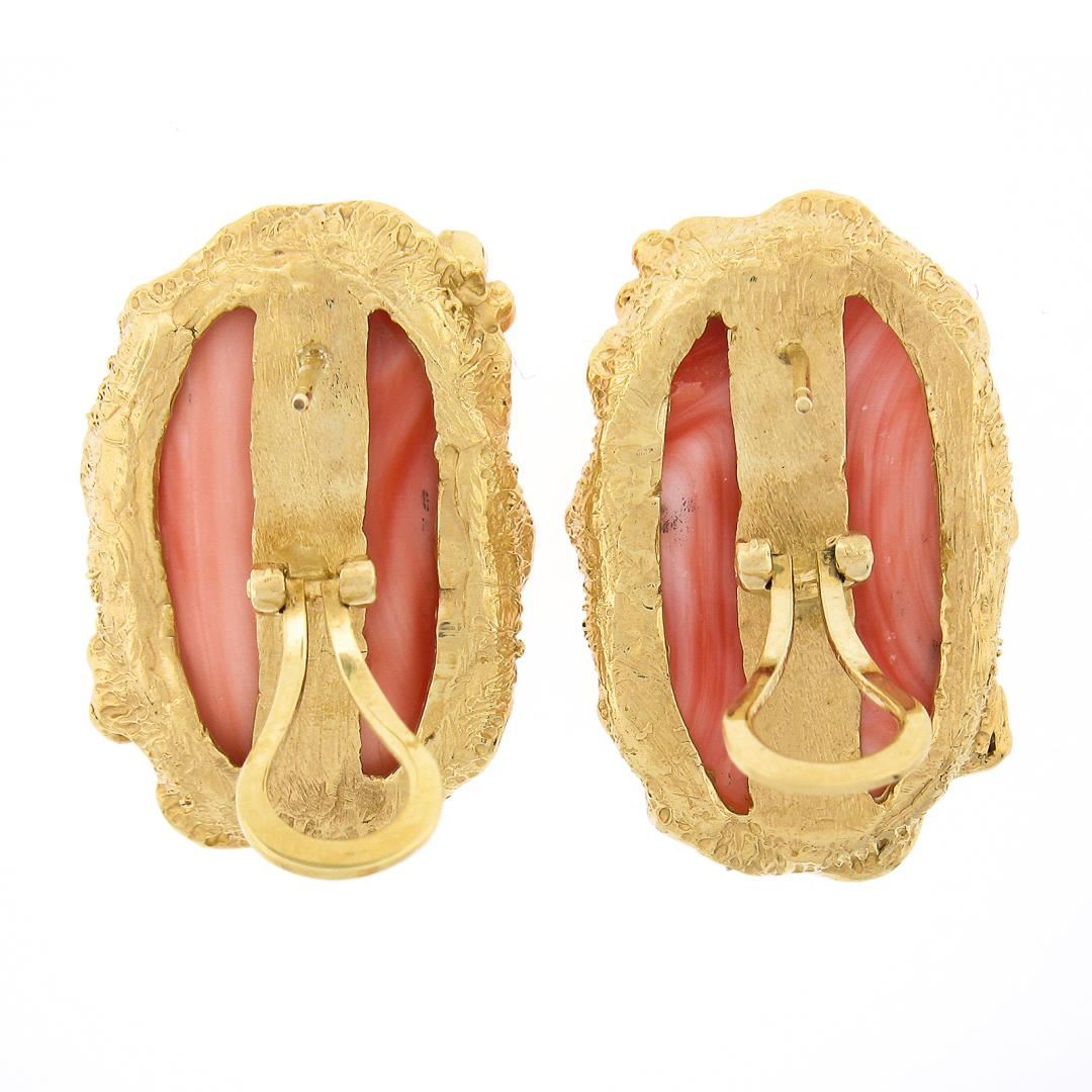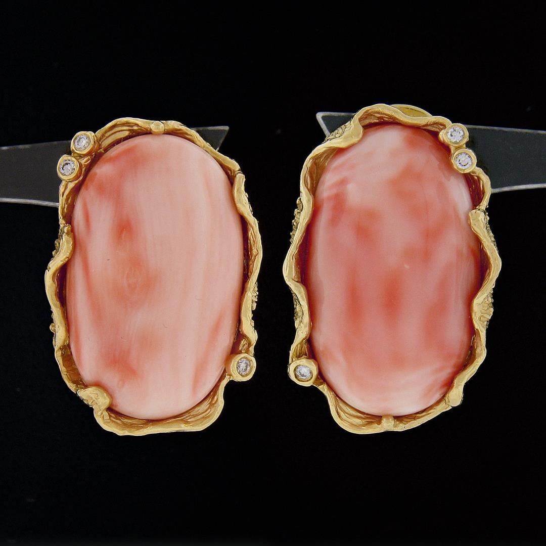 A solid 14k yellow gold earrings, with 2 oval cabochon cut natural corals (27x16.8mm & 27.3x16.1mm), and 6 round brilliant cut natural diamonds (G/H - VS2/SI1 ; 0.12ctw). The earrings measure approximately 30.2x20.5mm and weigh a total of 23.43 grams.