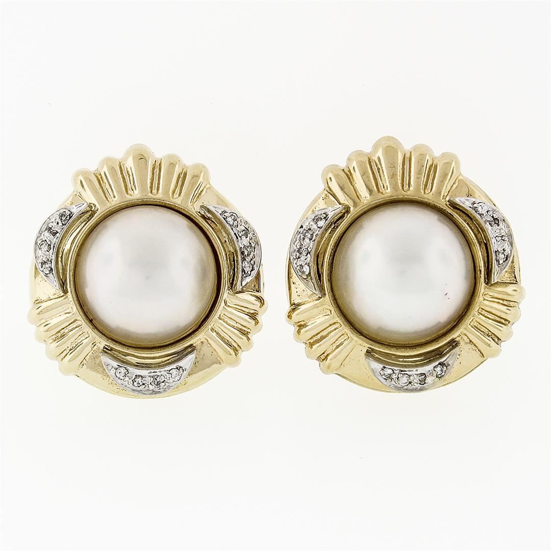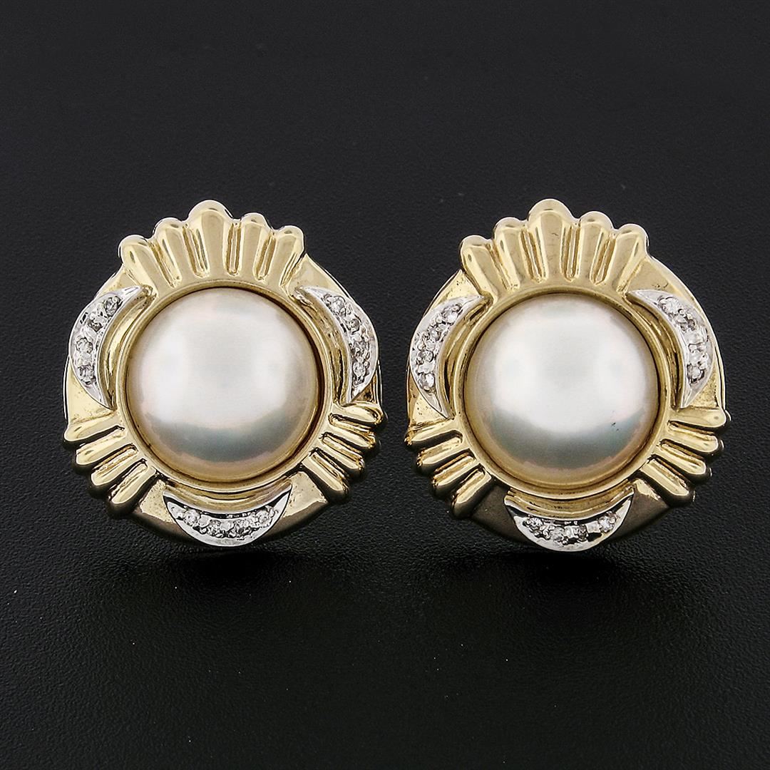 An estate solid 14k yellow & white gold button earrings, with 2 round shape mabe pearls (13.9mm), and 24 round brilliant cut natural diamonds (H/I - SI1/SI2 ; 0.12ctw). The earrings measure approximately 25.48mm in diameter and weigh a total of 9.70 grams.