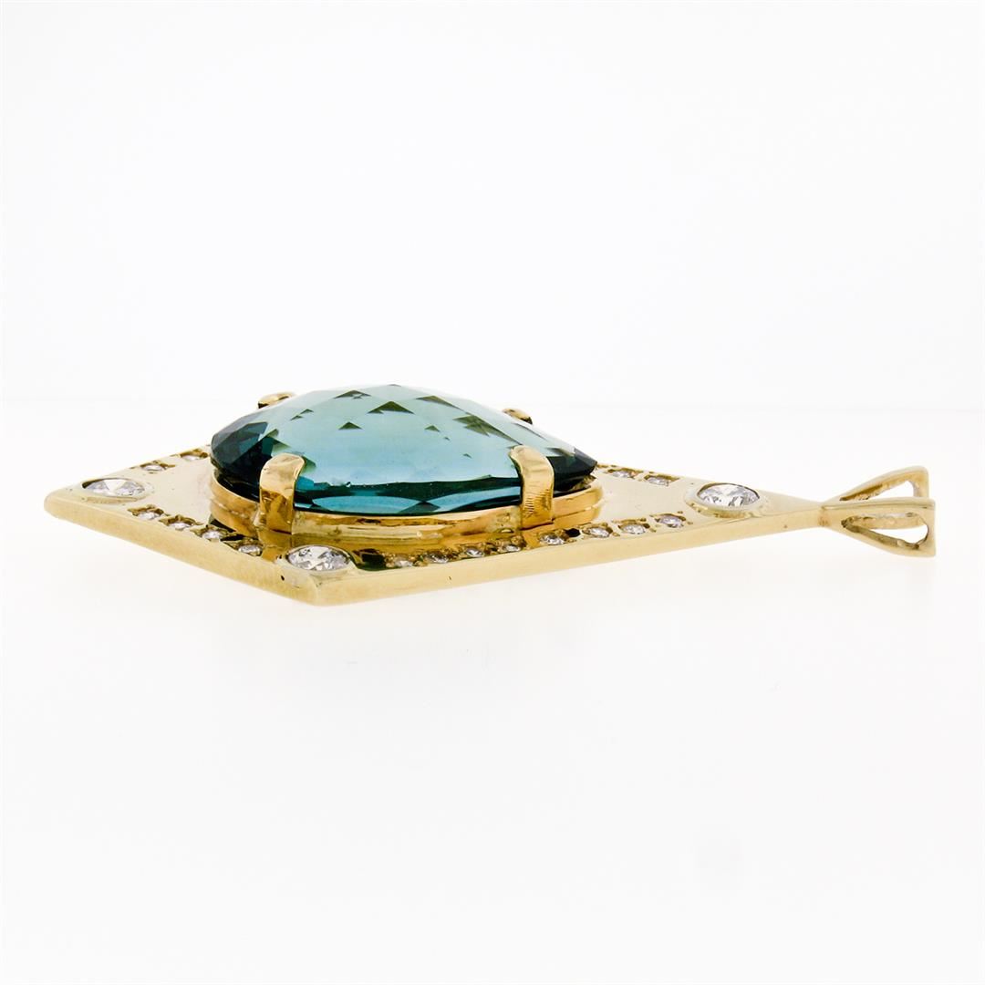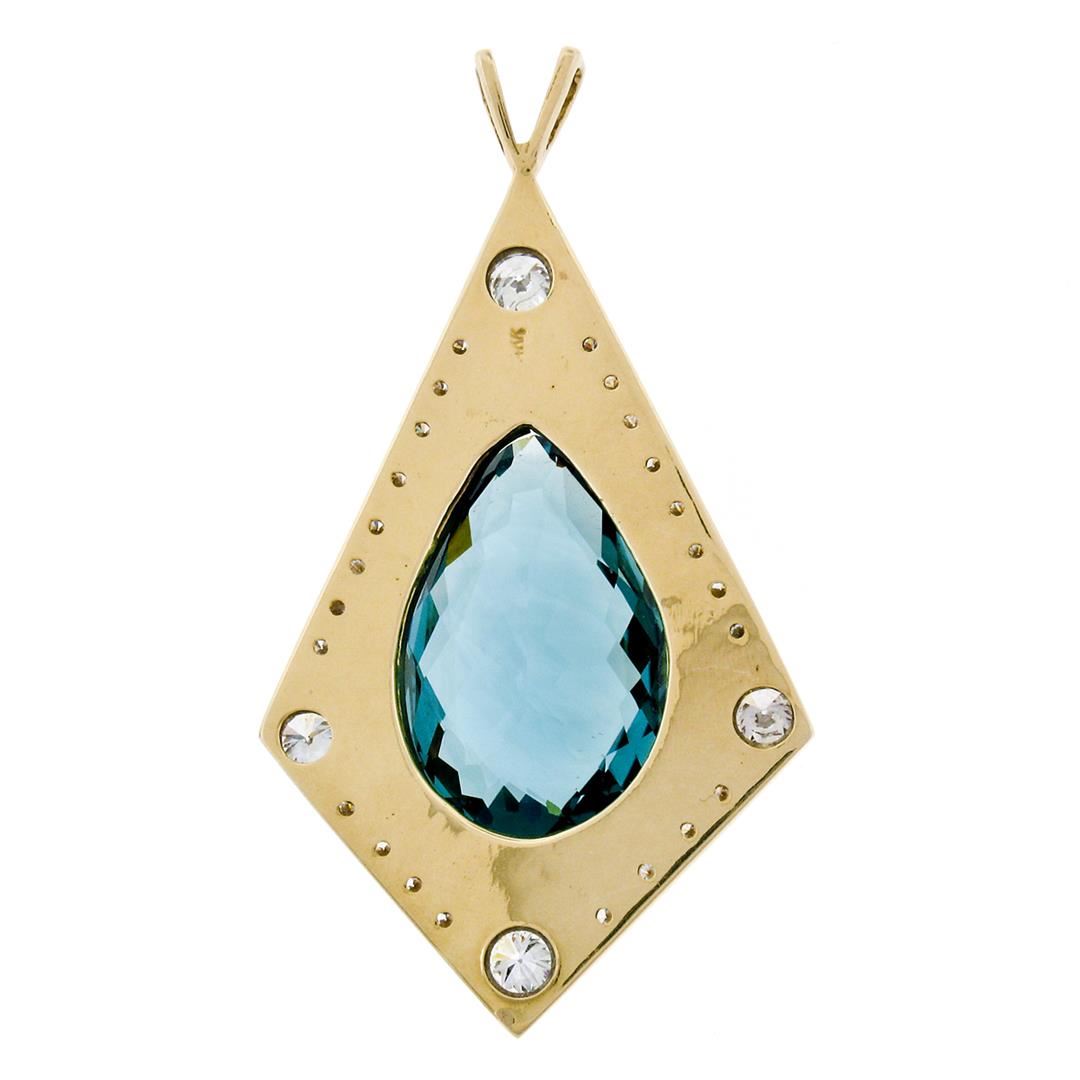An estate solid 14k yellow gold pendant necklace, with 1 teardrop checkerboard cut natural topaz (27.14x17.66mm - 28.94ct), with 4 round brilliant cut natural diamonds (G/H - VS1/SI1: 1.40ctw), and 24 round brilliant cut natural diamonds (F/G - VS1/VS2 ; 0.60ctw). The pendant weighs a total of 23.73 grams, measures 62.71x34.91mm including the bail, and the inside of the bail measures 4.1x1.7mm.