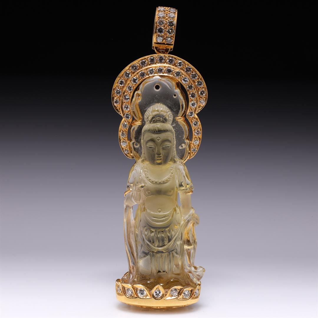 Large 18k yellow gold pendant designed by Carlo Rici; featuring a Chinese finely carved citrine figure of a standing Guanyin, partially polished and brushed, expertly mounted with gold lotus form base, mandorla and bale, each mounted with numerous white d