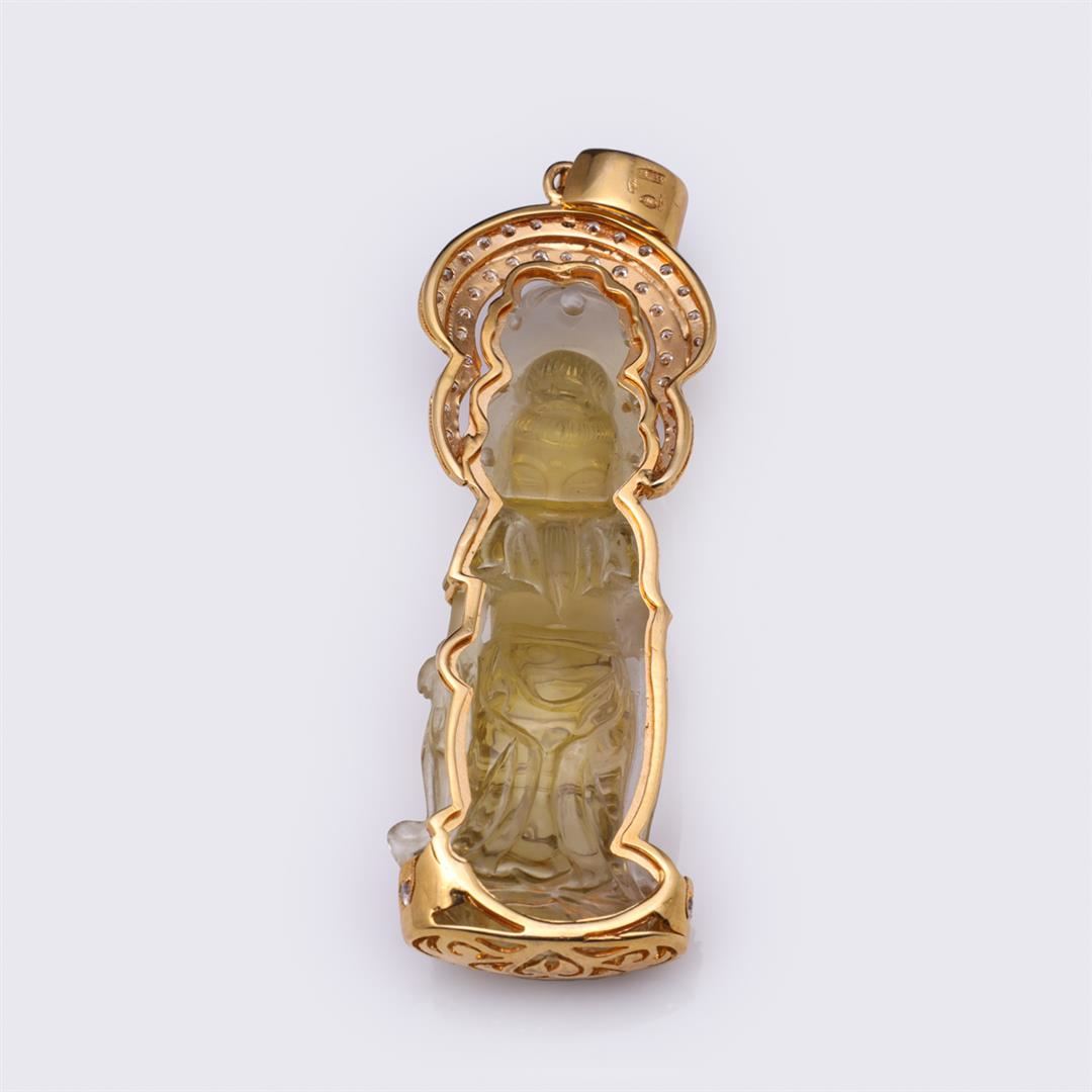 Large 18K Yellow Gold & Diamond Pendant with Carved Citrine Guanyin by Carlo Rici containing fifty-nine round brilliant diamonds weighing approximately 1.10 cts. Total weight is 31.7 gm. Estimated retail value $4,900.