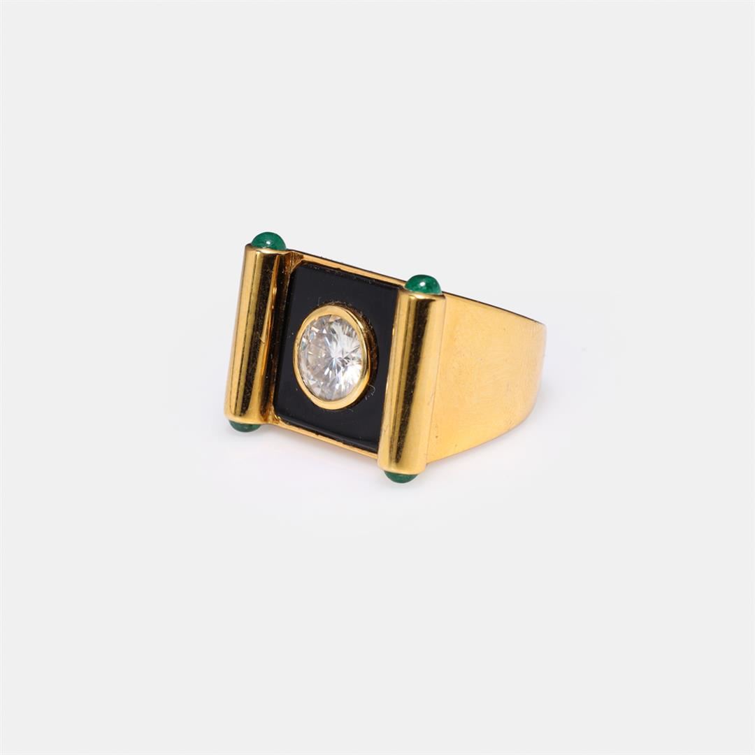 Large 18k yellow gold ring designed by Carlo Rici; the table with flat black onyx square centered with large round cut moissanite, then ends of the square terminating into scroll ends, each capped with bright green emeralds cabochons, marked 750 RICI to i