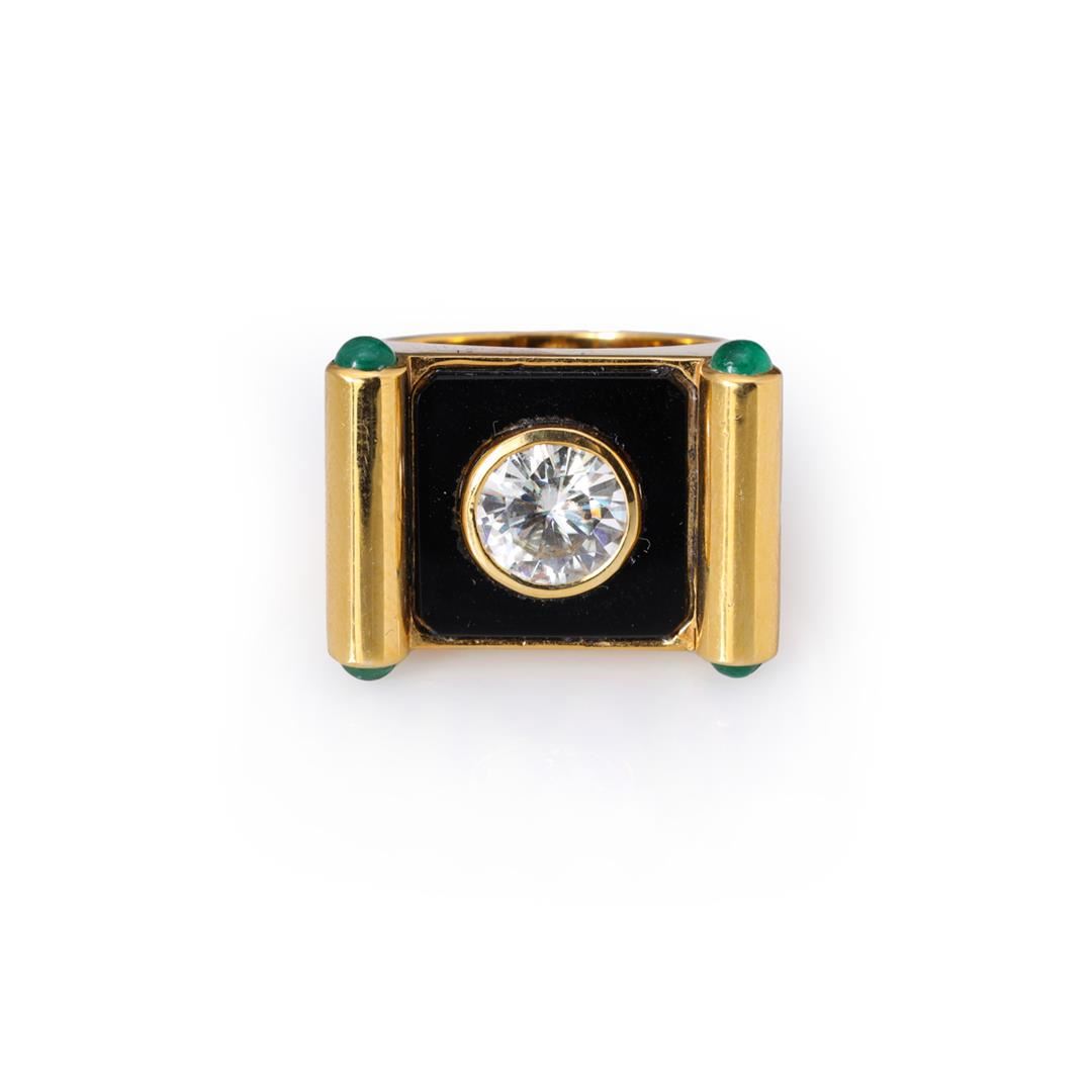 18k Yellow Gold Black Onyx inlay, Moissanite & Emerald Ring by Carlo Rici containing one round moissanite weighing approximately 2.0 cts. Four cabochon emeralds weighing approximately 0.30 cts. Total weight is 16.5 gm. Estimated retail value $6,500.