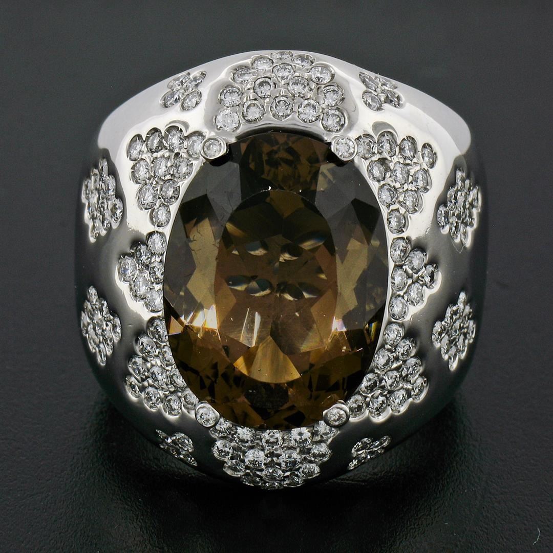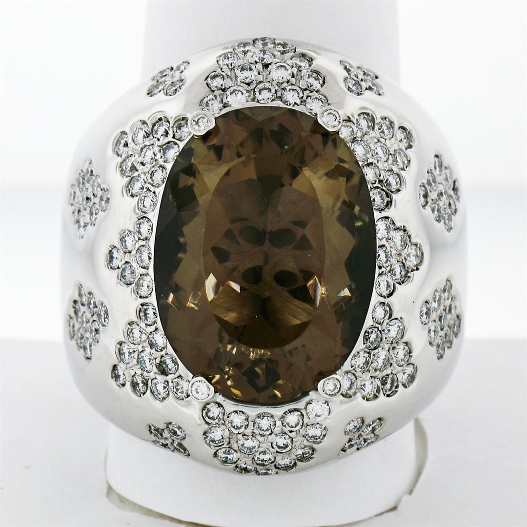 An estate solid 18k whte gold cocktail ring, with 1 oval cut natural smoky quartz (18.75x14.20mm), and 134 round brilliant cut natural diamonds (G/H- VS1/VS2 ; 2.50ctw). The ring is size 10, weighs a total of 30.85 grams, and measures 28.25mm wide.
