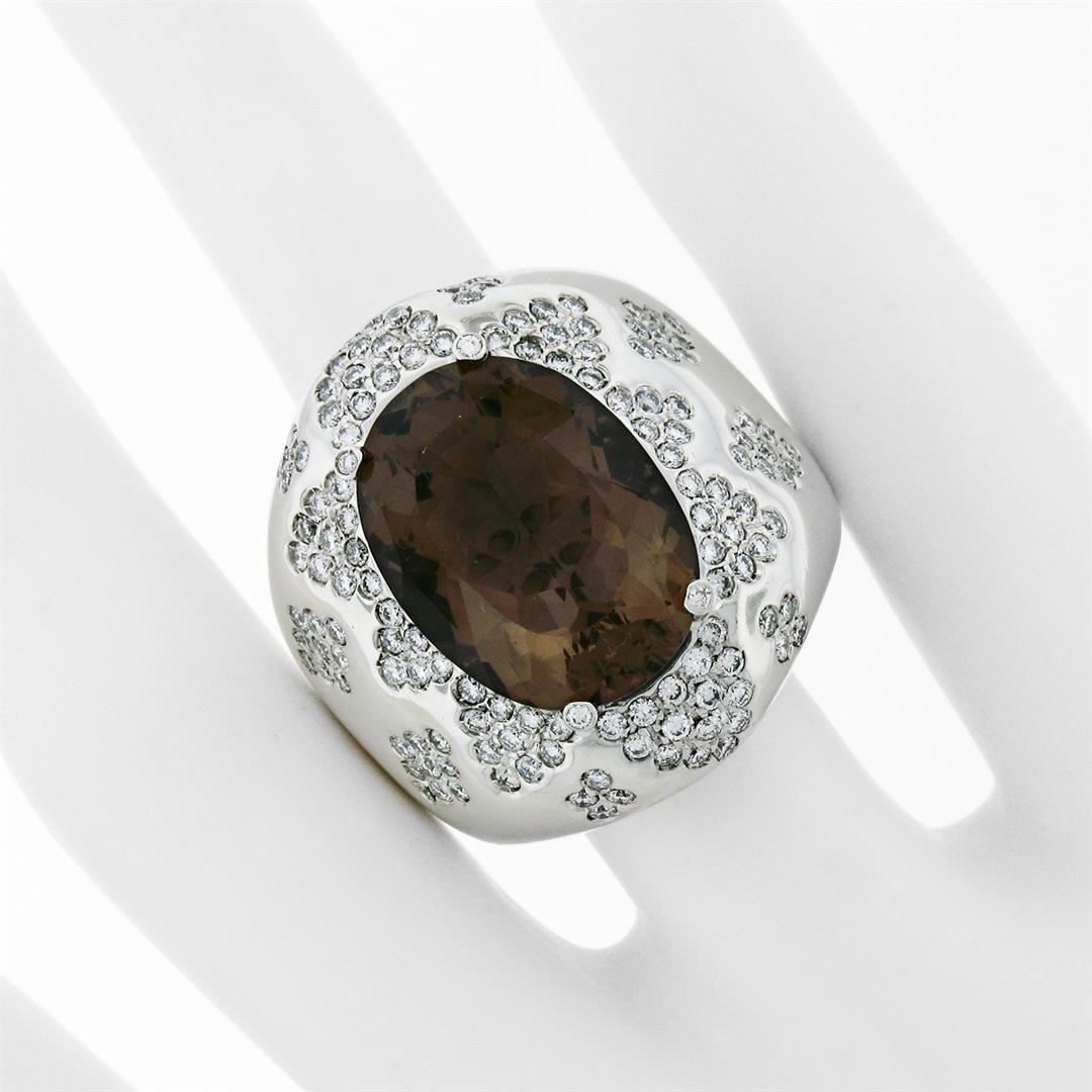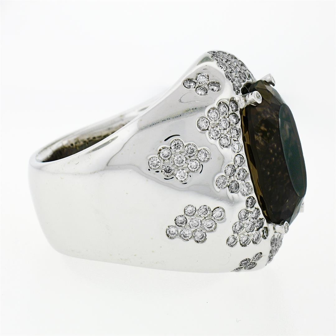 An estate solid 18k whte gold cocktail ring, with 1 oval cut natural smoky quartz (18.75x14.20mm), and 134 round brilliant cut natural diamonds (G/H- VS1/VS2 ; 2.50ctw). The ring is size 10, weighs a total of 30.85 grams, and measures 28.25mm wide.