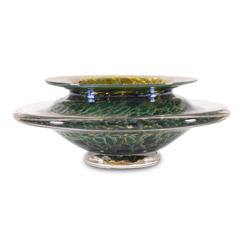 This hand-blown "Large Ikebana Flower Bowl" features a secured "Kenzan" spiked disc inside - the key to any fine Ikebana style flower arrangement. This one-of-a-kind flower bowl is hand signed by GartnerBlade Glass. Measures approx. 8" (diameter) x 4" (height).