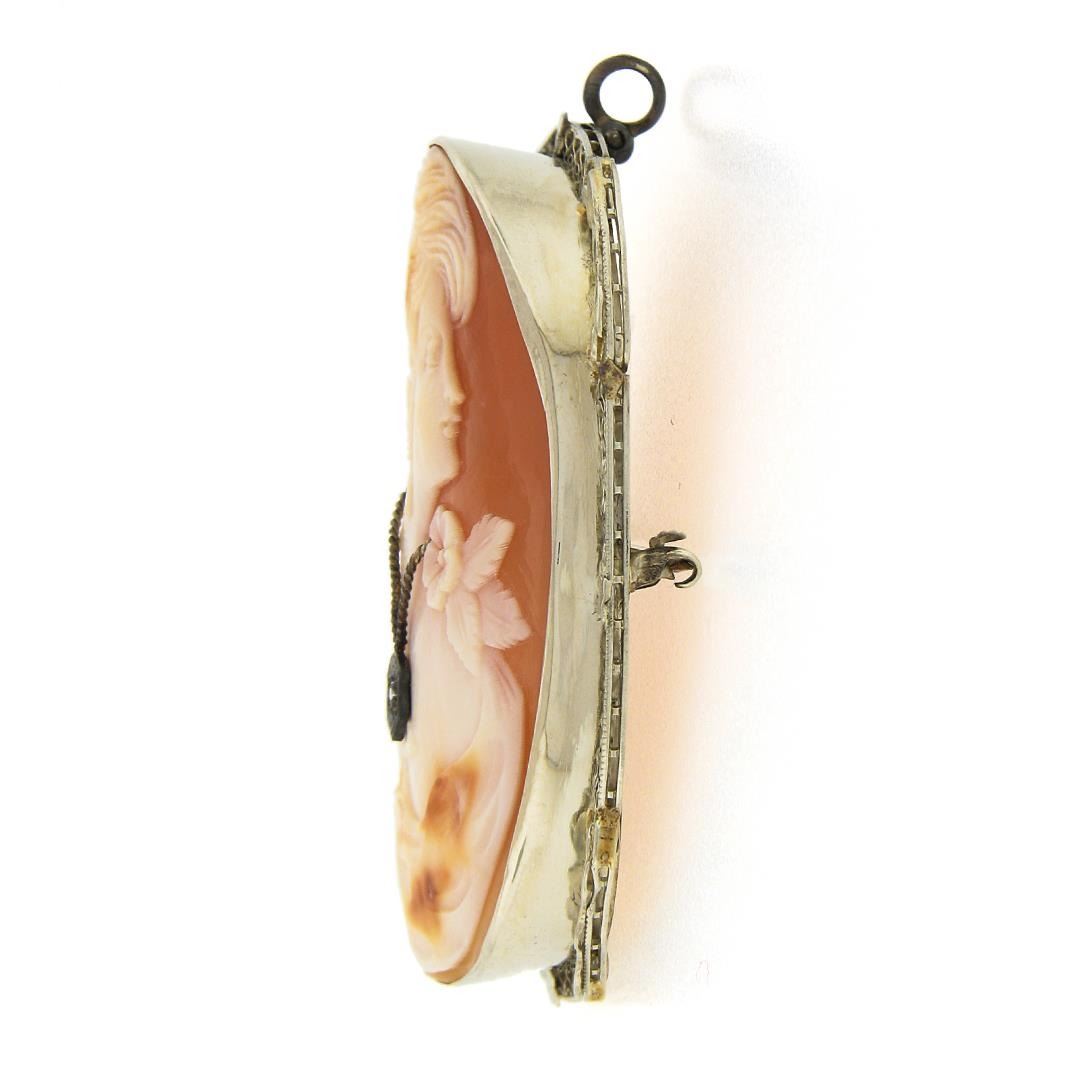 A vintage solid 14k white gold brooch pendant, with 1 oval cut carved cameo shell (48.6x35.5mm), and 1 single cut natural diamond (H - SI2 ; 0.03ct). Measures 52.2x42.2mm and weighs a total of 13.96 grams.