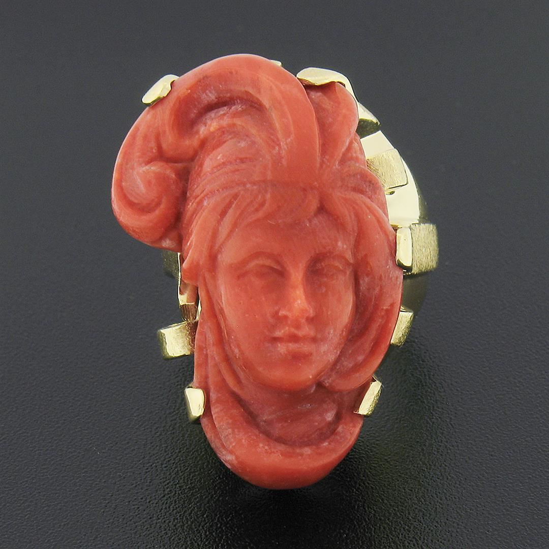 A solid 14k yellow gold statement ring, with 1 Gia certified carved cameo lady face natural coral (29.33 grams). The ring is size 7.5, weighs a total of 29.33 grams, and measures 33.55mm wide. Comes with all original relevant certifications.