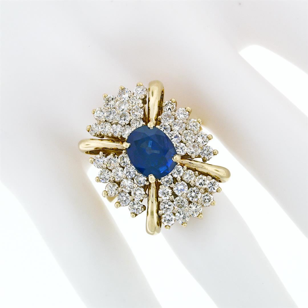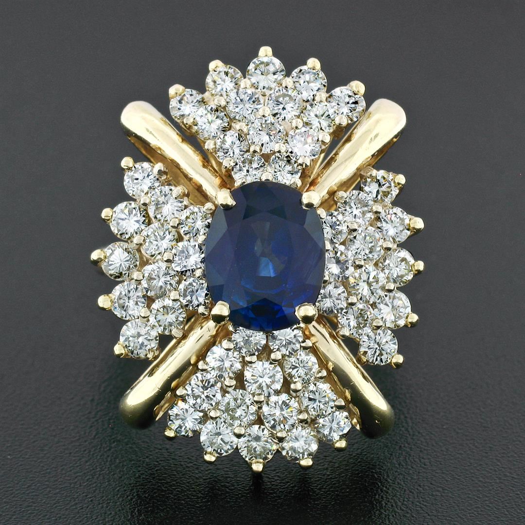 A vintage solid 14k yellow gold statement ring with a GIA certified oval ceylon sapphire (3.18ct) and 52 natural diamonds (I/J - VS1/VS2; 3.06ctw). The ring is size 9.0, weighs a total of 15.33 grams, and measures 28.77mm wide. Comes with all original relevant certifications.