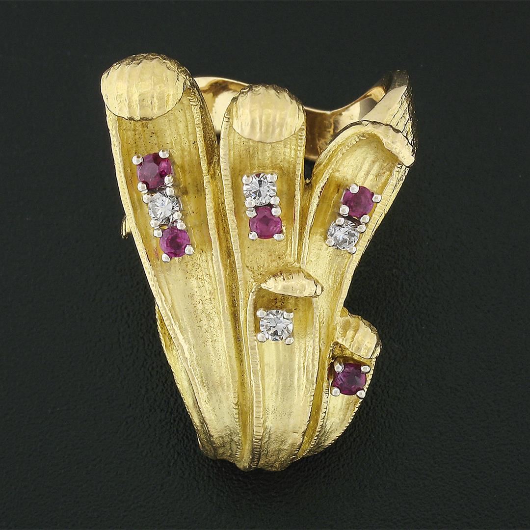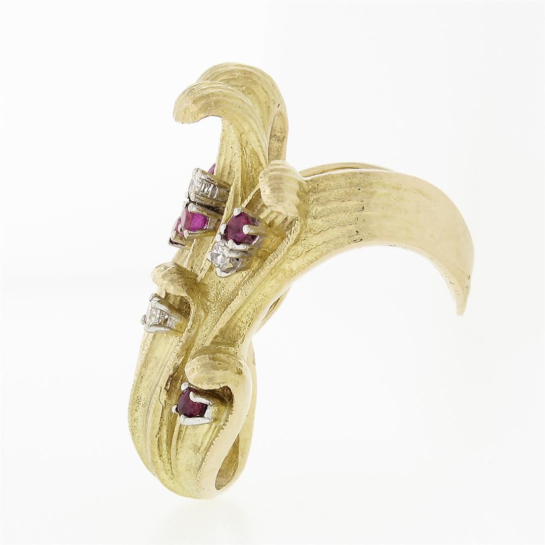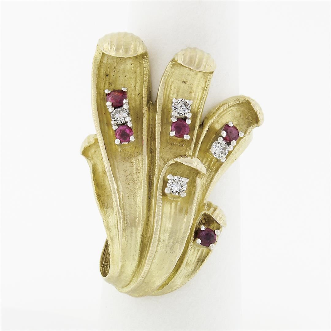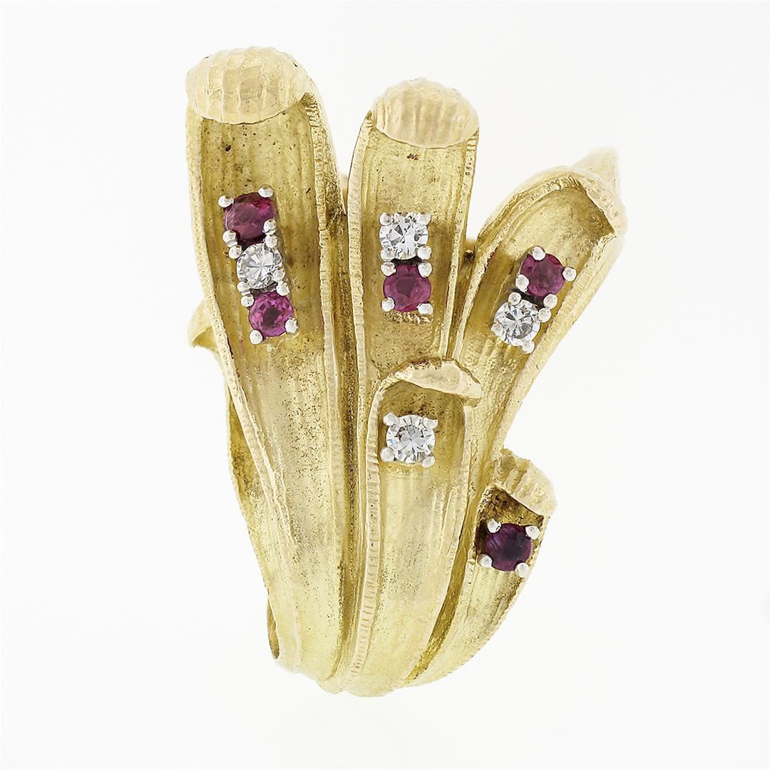 A vintage solid 18k yellow gold leaf ring, with 5 round brilliant cut natural rubies (0.30ctw), & 4 round brilliant cut natural diamonds (F/G- VS1/VS2; 0.20ctw). The ring is size 6.5, weighs a total of 21.58 grams, and measures 34.5mm wide.