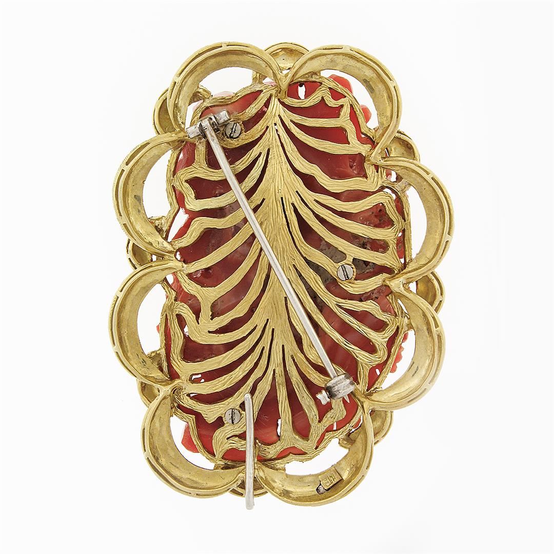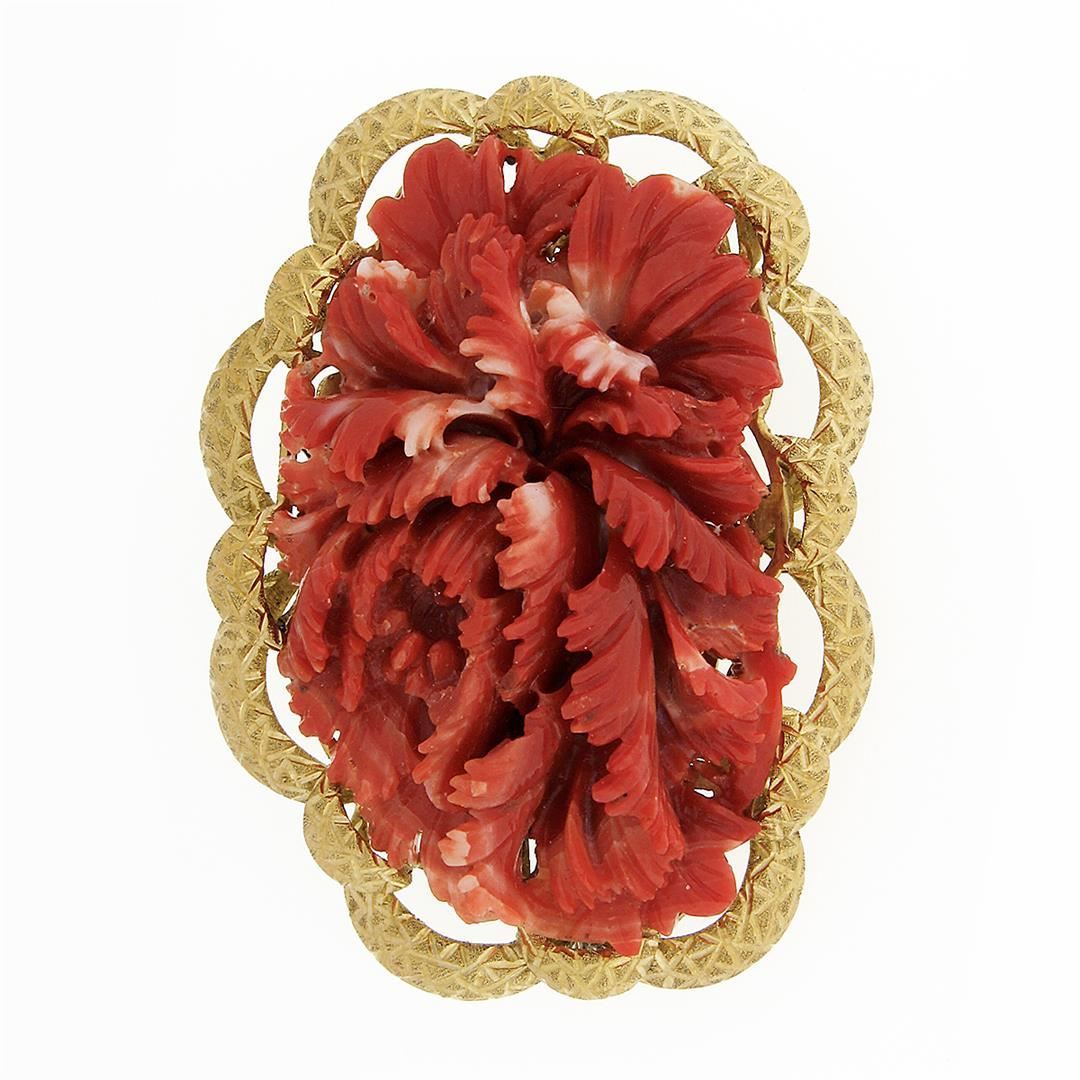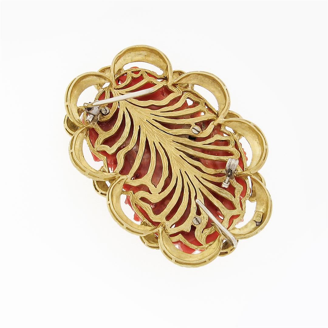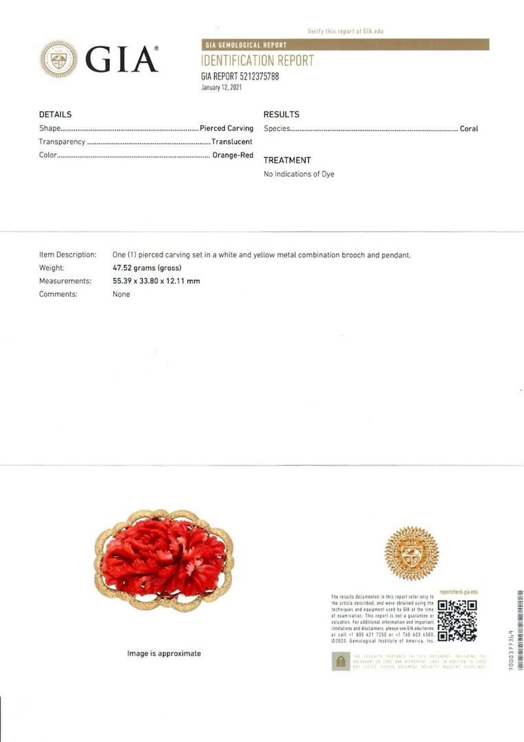 A vintage solid 18k yellow gold large pin brooch, with 1 Gia certified no dye carved natural coral ( 55.39x33.80mm). Measures 62.12x45.95mm and weighs a total of 47.52 grams. Comes with all original relevant certifications.